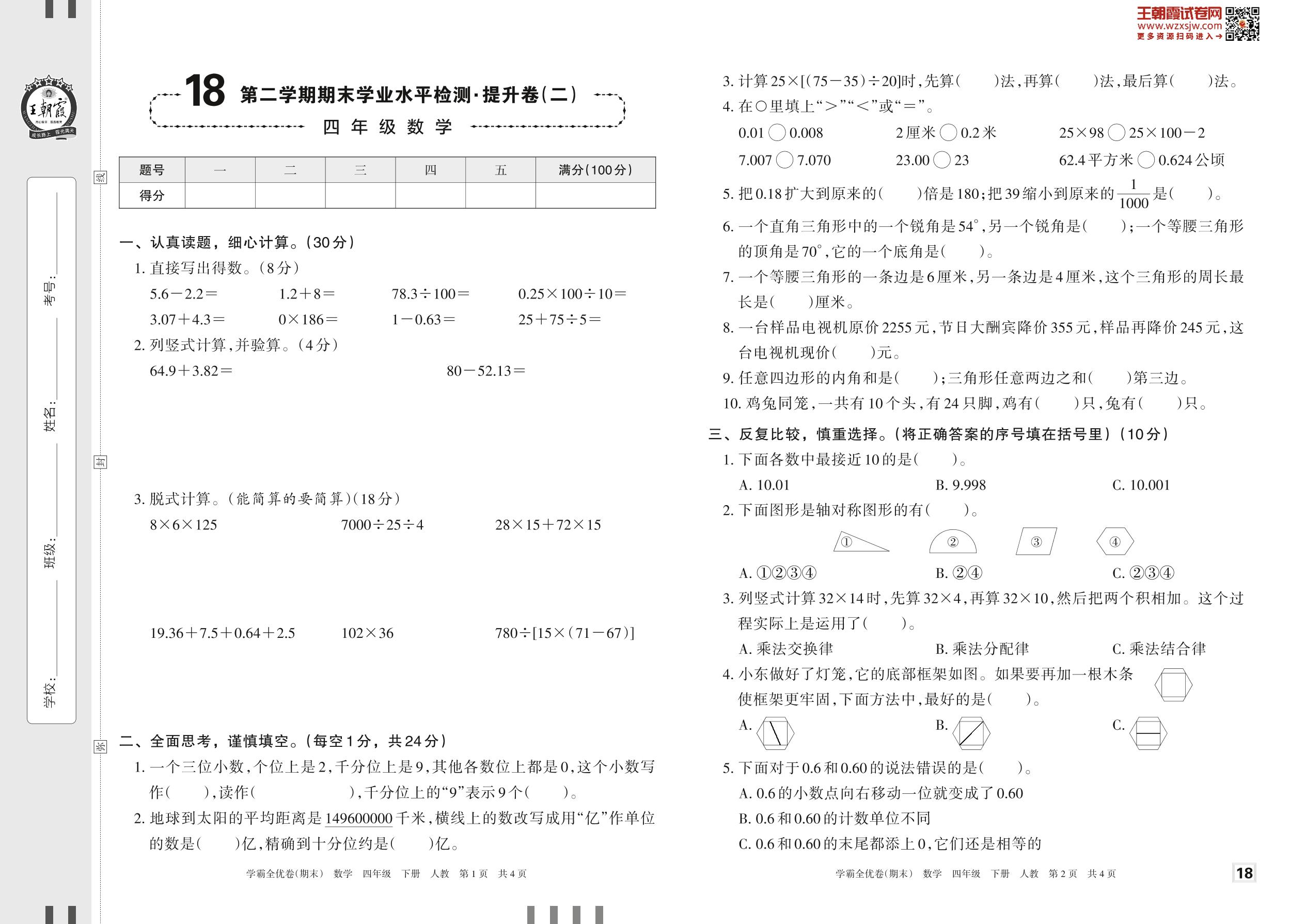 2023下册四年级数学人教版 18 第二学期期末学业水平检测·提升卷(二)
