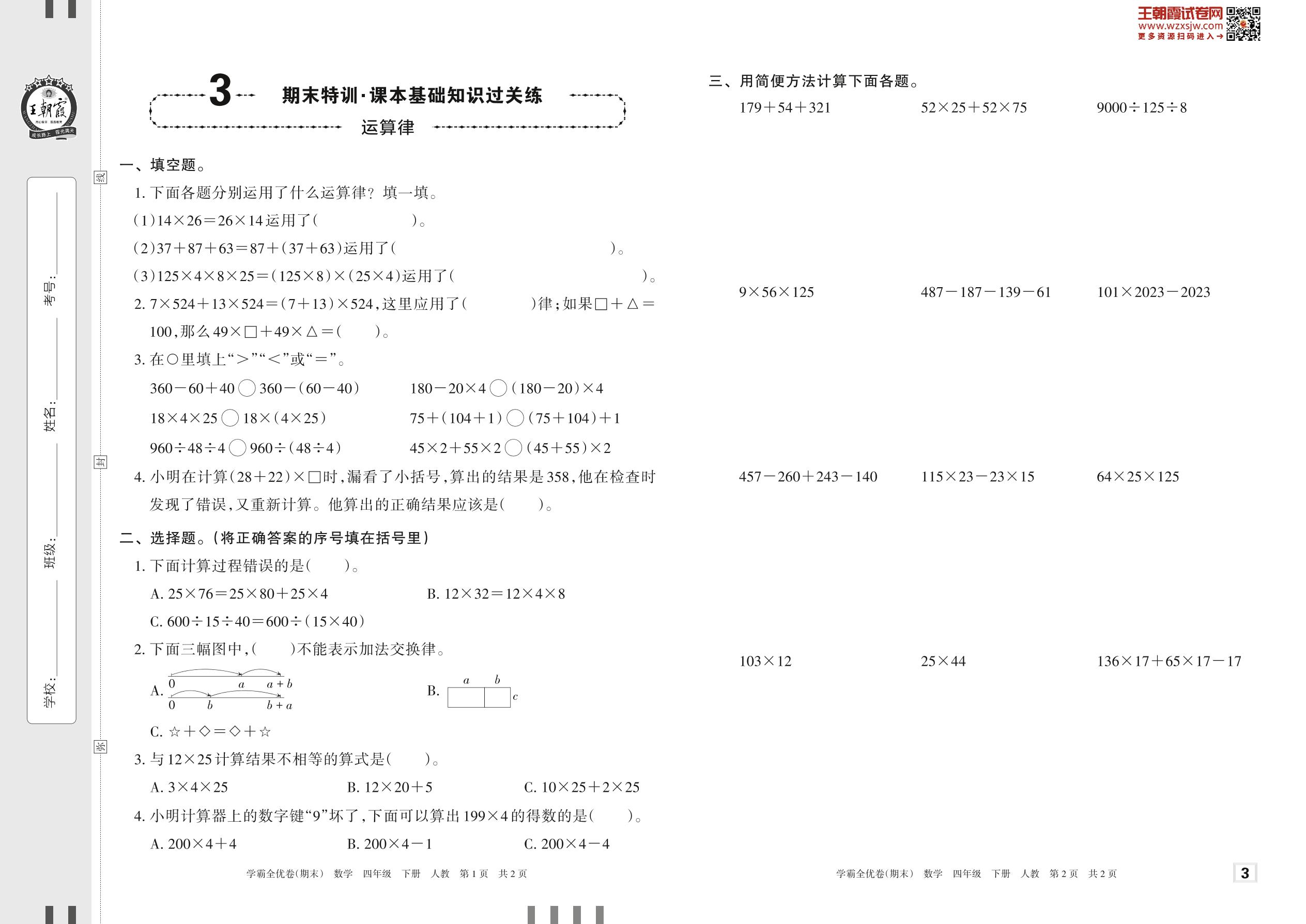 2023下册四年级数学人教版 3 期末特训·课本基础知识过关练——运算律