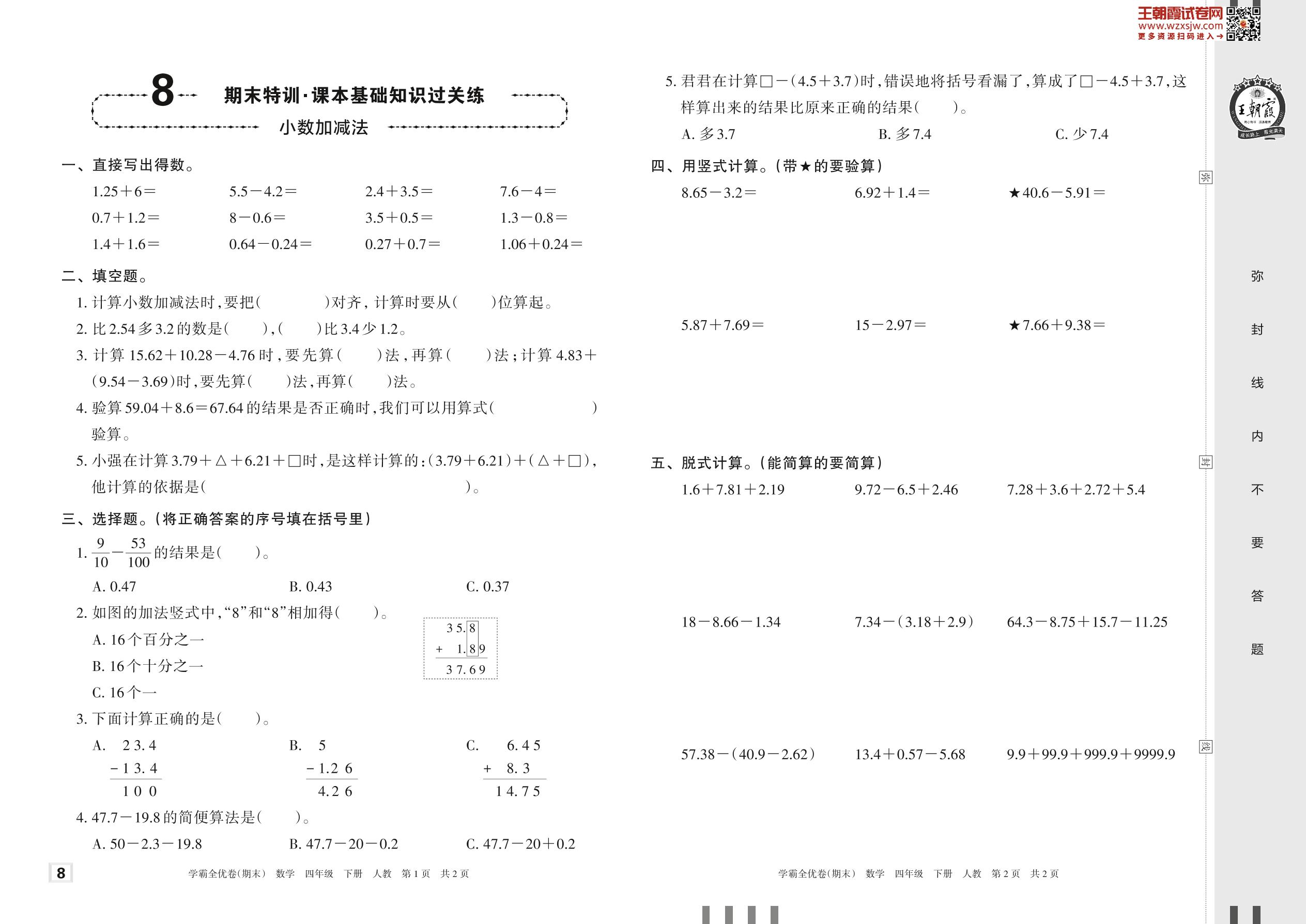 2023下册四年级数学人教版 8 期末特训·课本基础知识过关练——小数加减法