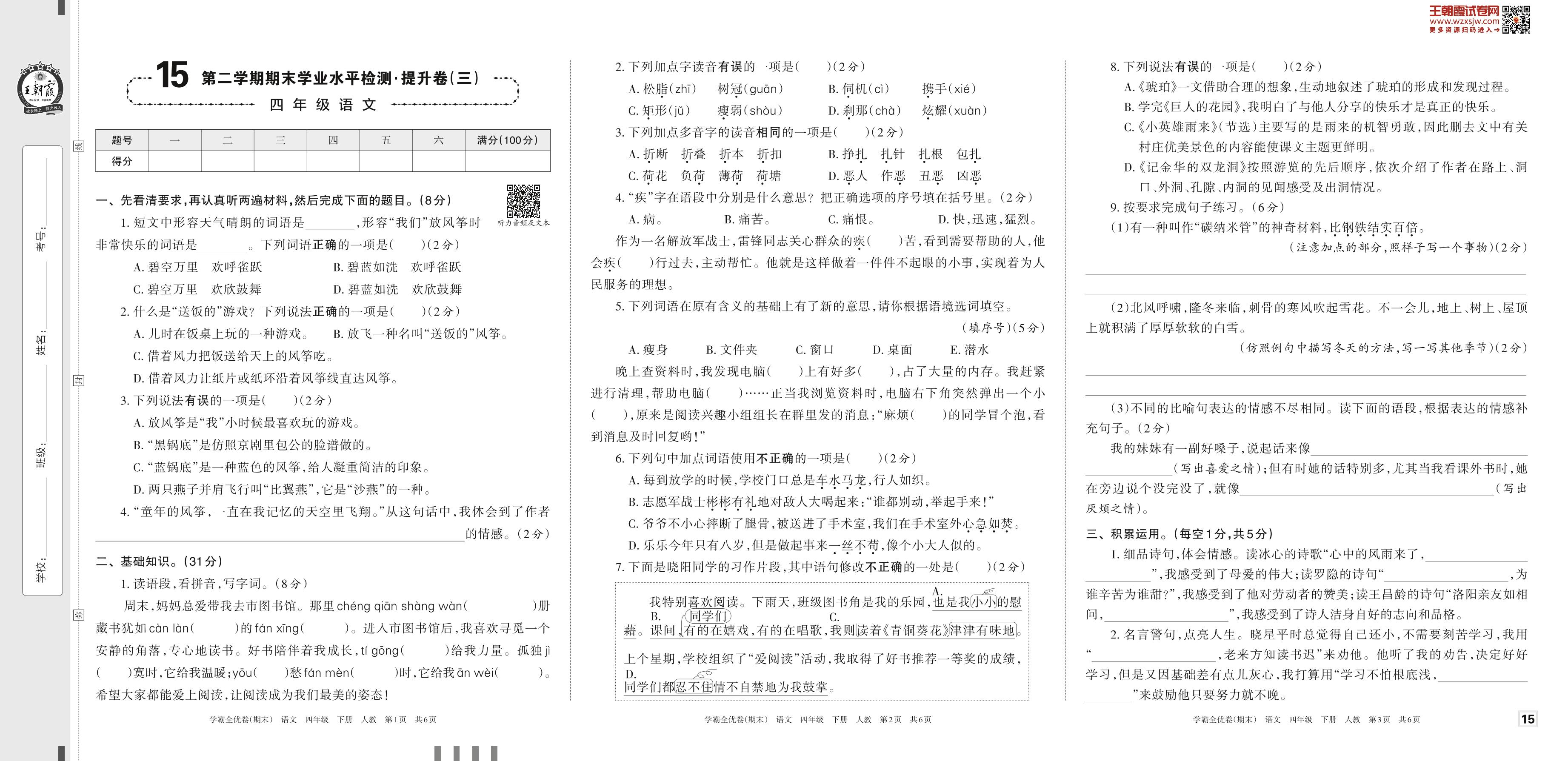 2023下册四年级语文人教版 15 第二学期期末学业水平检测·提升卷(三)