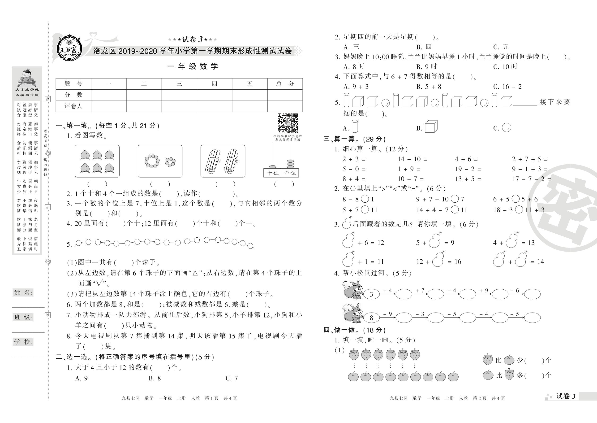 2019-2020学年第一学期洛阳市洛龙区一年级数学试卷(人教版)【3】