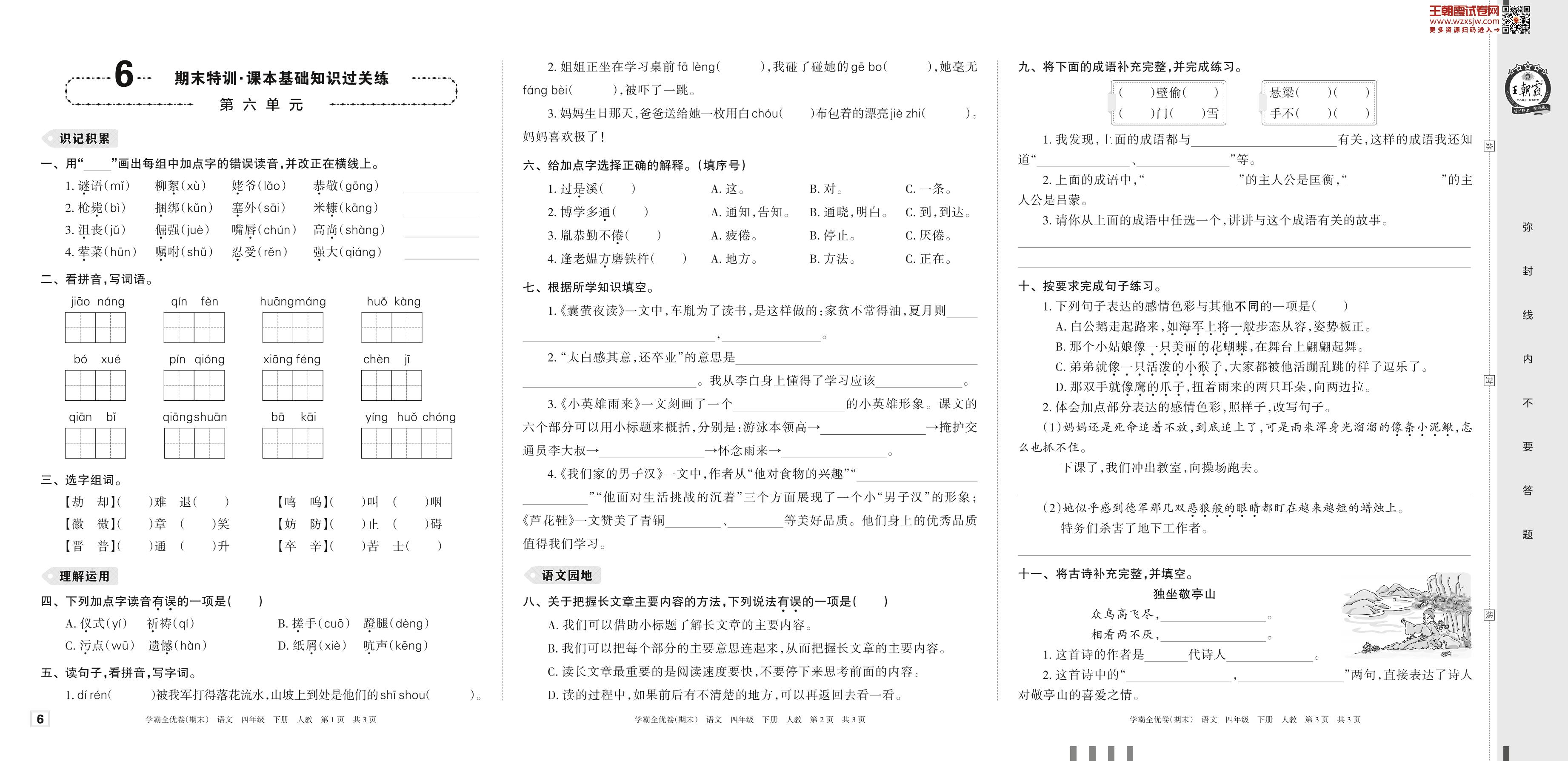2023下册四年级语文人教版 6 期末特训·课本基础知识过关练——第六单元