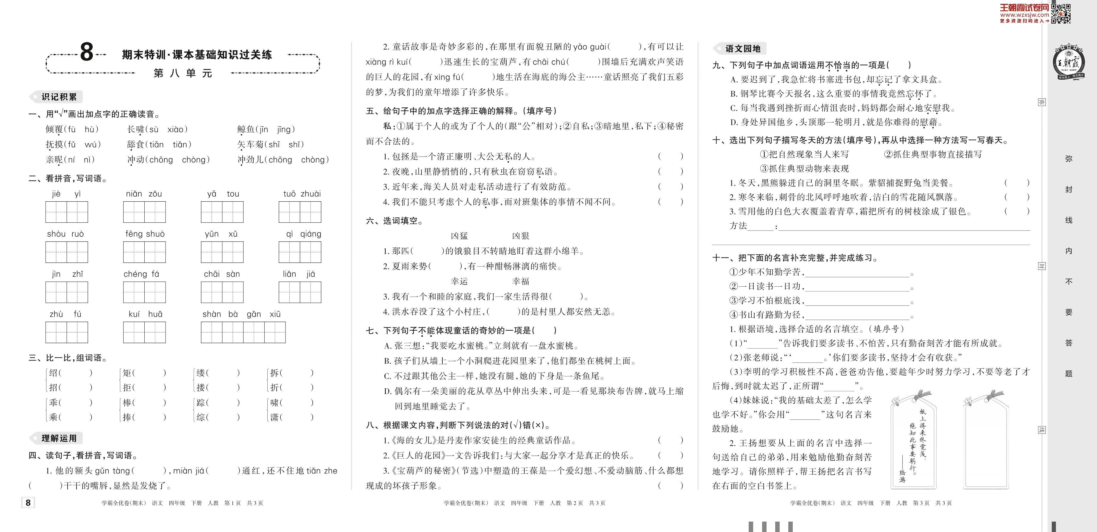2023下册四年级语文人教版 8 期末特训·课本基础知识过关练——第八单元