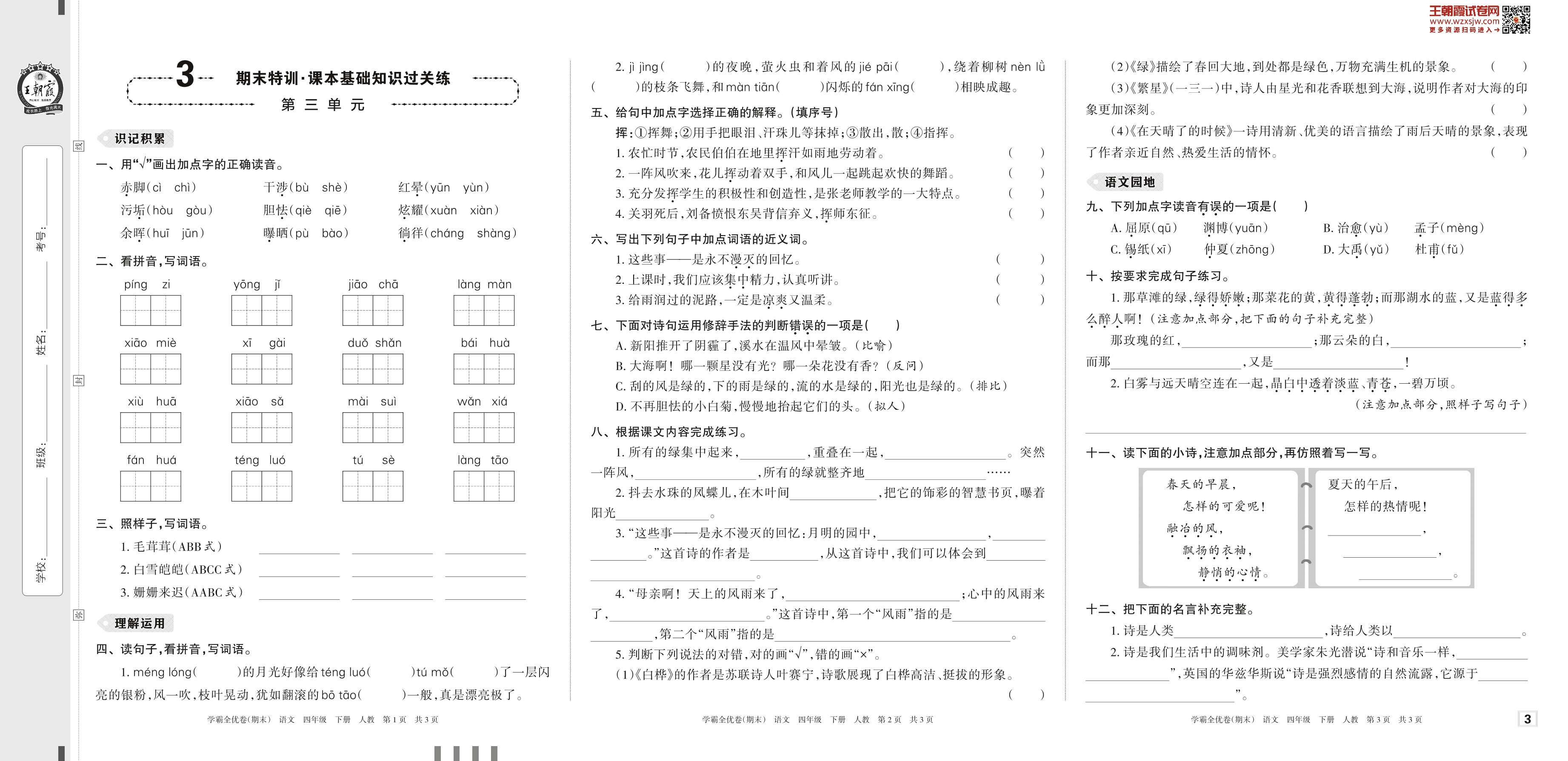 2023下册四年级语文人教版 3 期末特训·课本基础知识过关练——第三单元