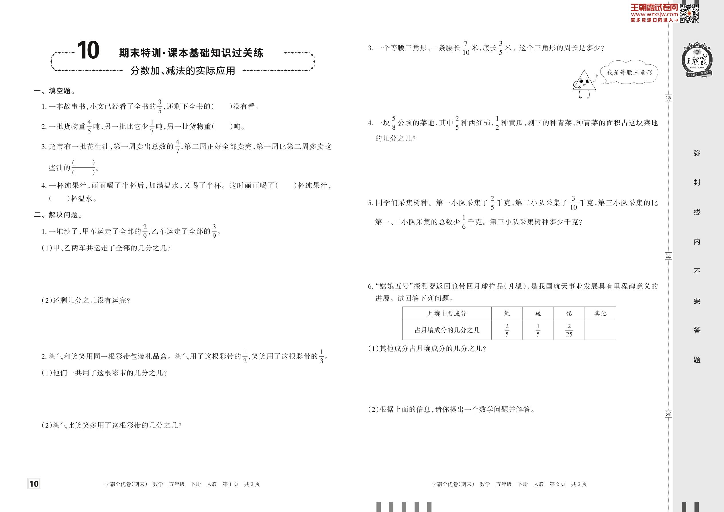 2023下册五年级数学人教版 10 期末特训·课本基础知识过关练——分数加、减法的实际应用