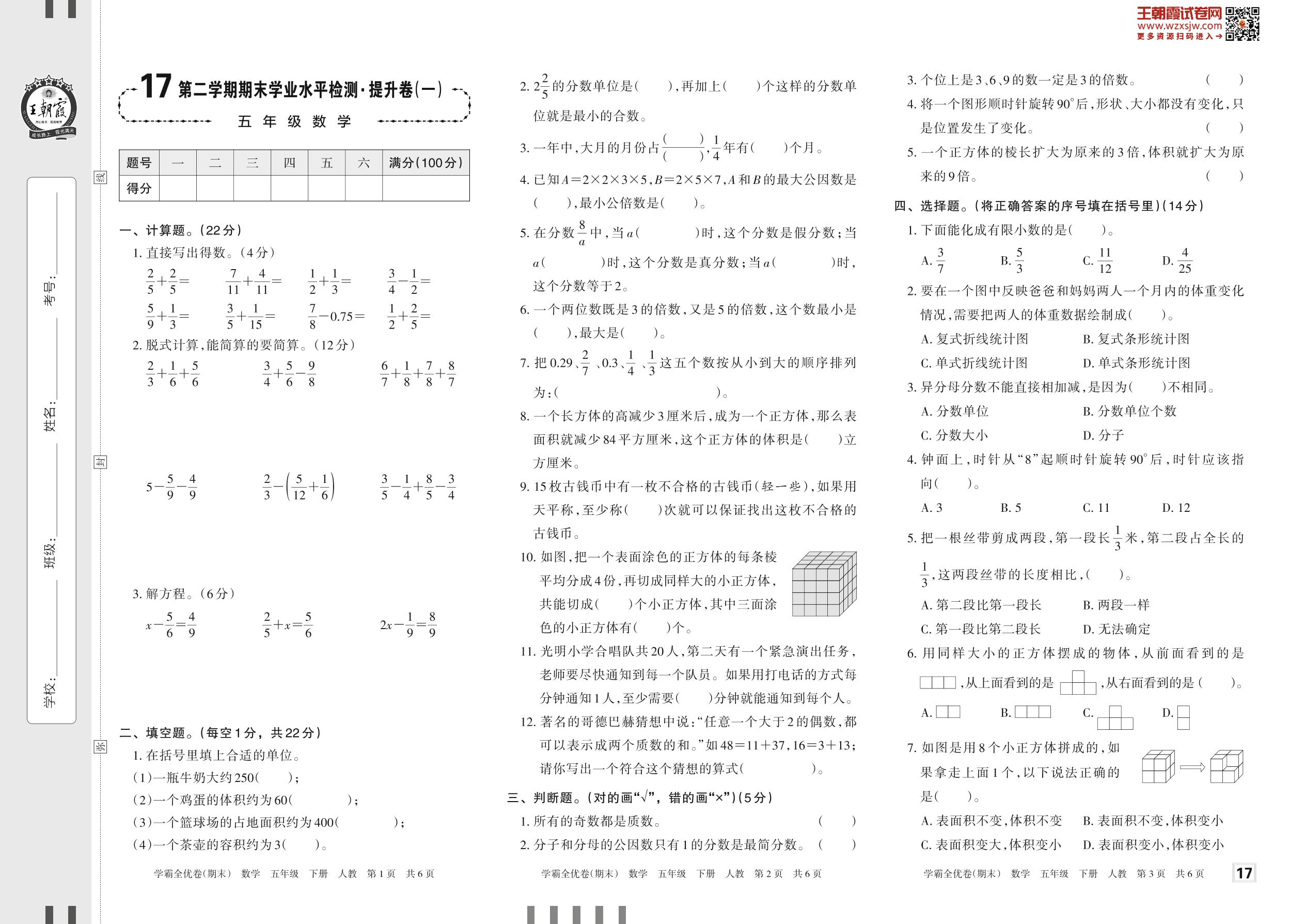 2023下册五年级数学人教版 17 第二学期期末学业水平检测·提升卷(一)