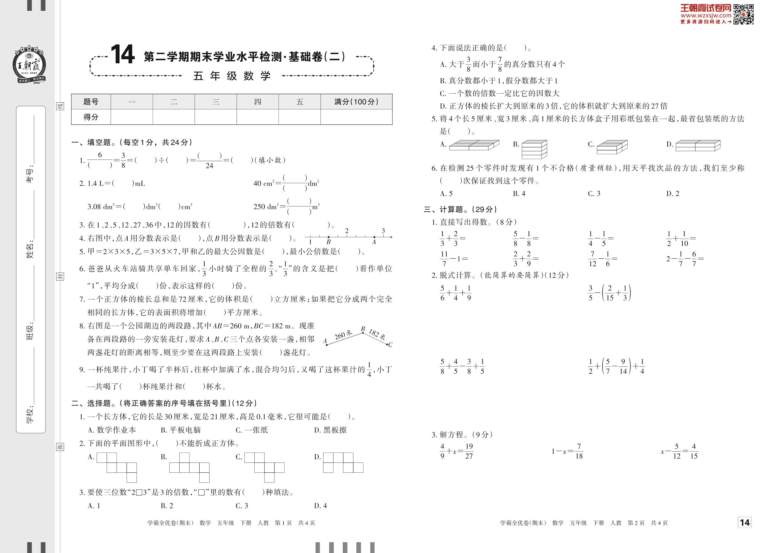 2023下册五年级数学人教版 14 第二学期期末学业水平检测·基础卷(二)