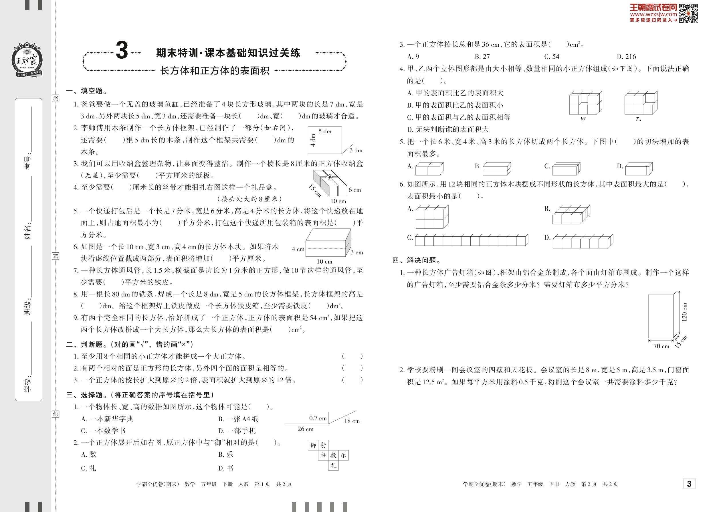 2023下册五年级数学人教版 3 期末特训·课本基础知识过关练——长方体和正方体的表面积