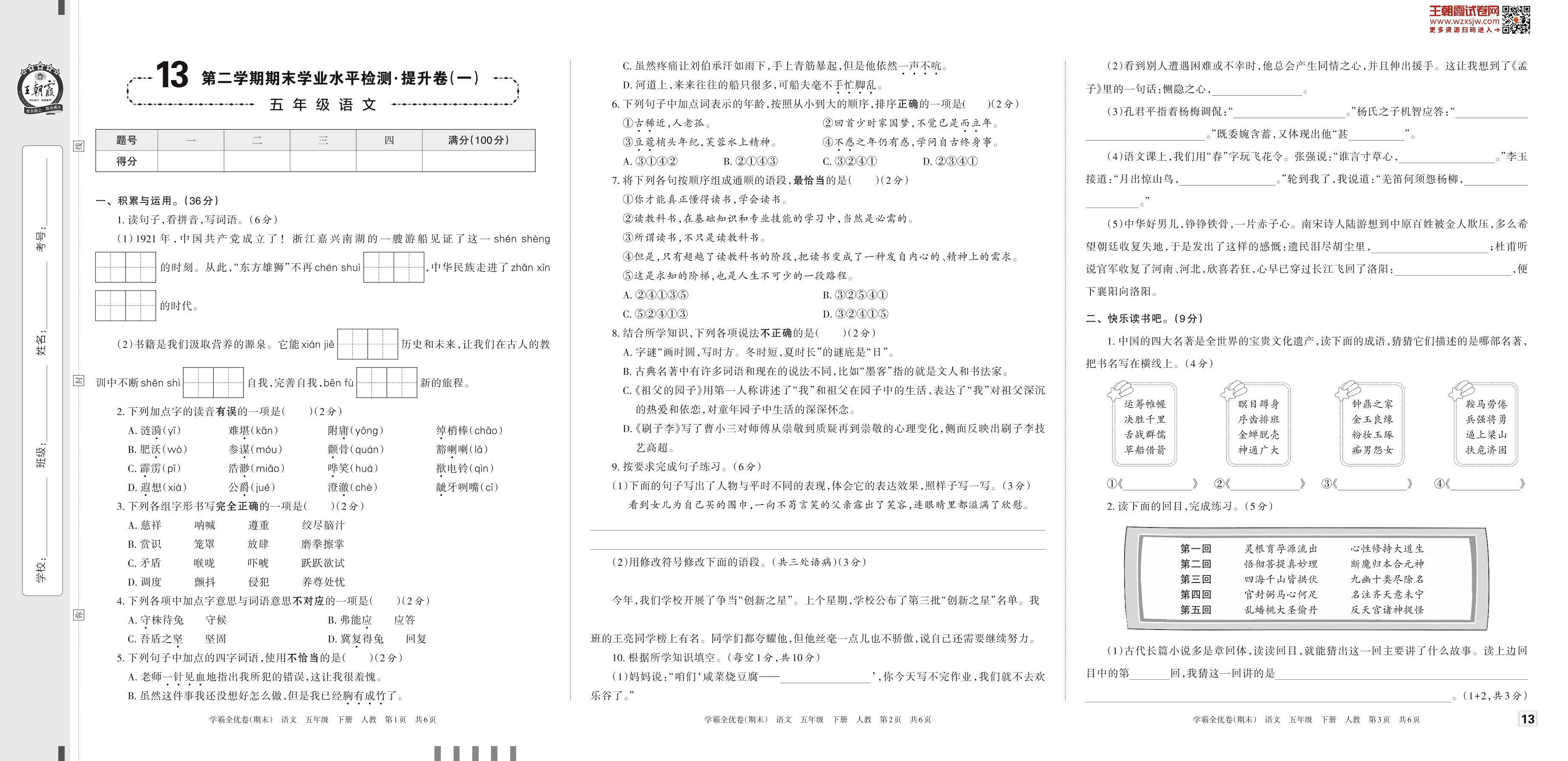 2023下册五年级语文人教版 13 第二学期期末学业水平检测·提升卷(一)