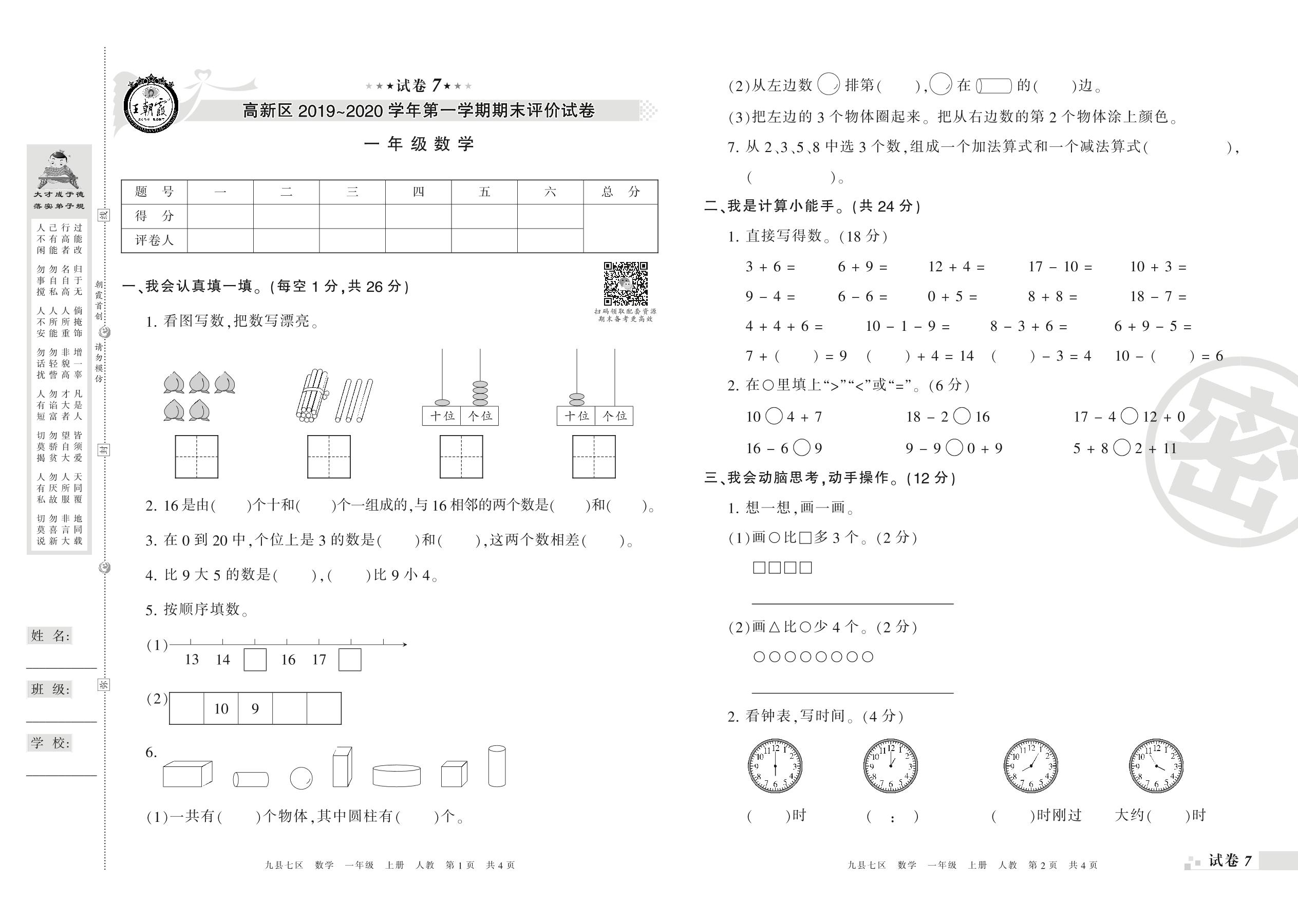2019-2020学年第一学期洛阳市高新区一年级数学试卷(人教版)【7】