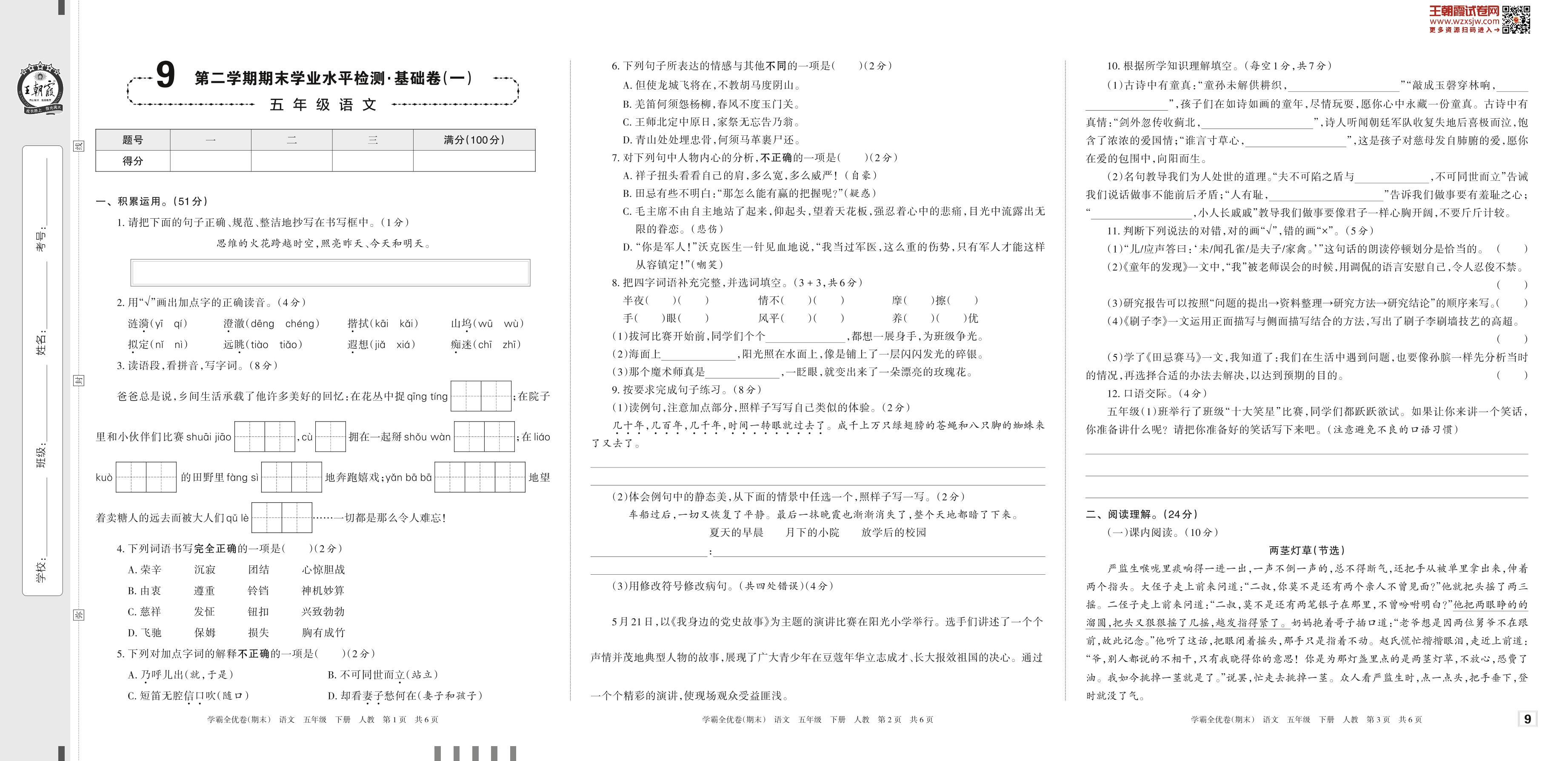 2023下册五年级语文人教版 9 第二学期期末学业水平检测·基础卷(一)