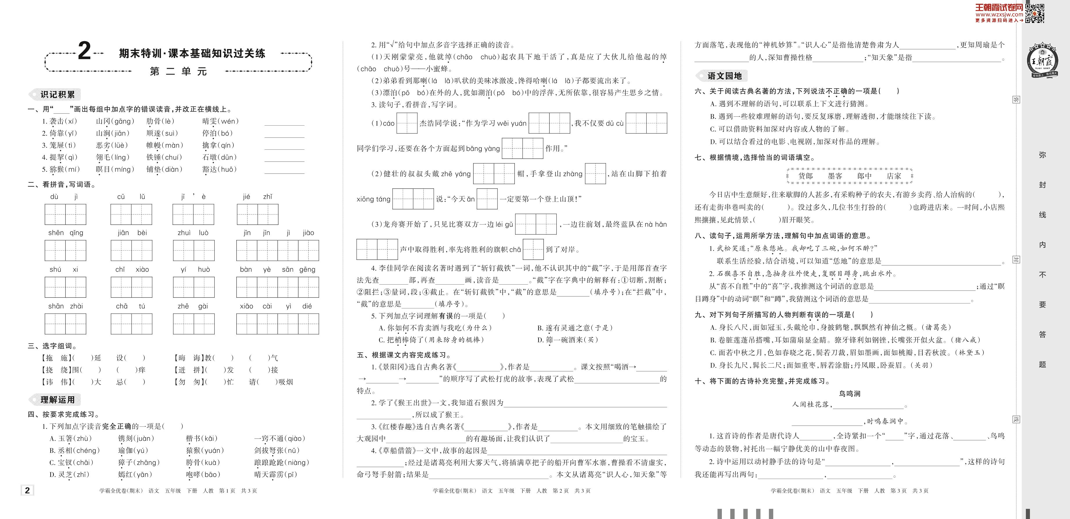 2023下册五年级语文人教版 2 期末特训·课本基础知识过关练——第二单元