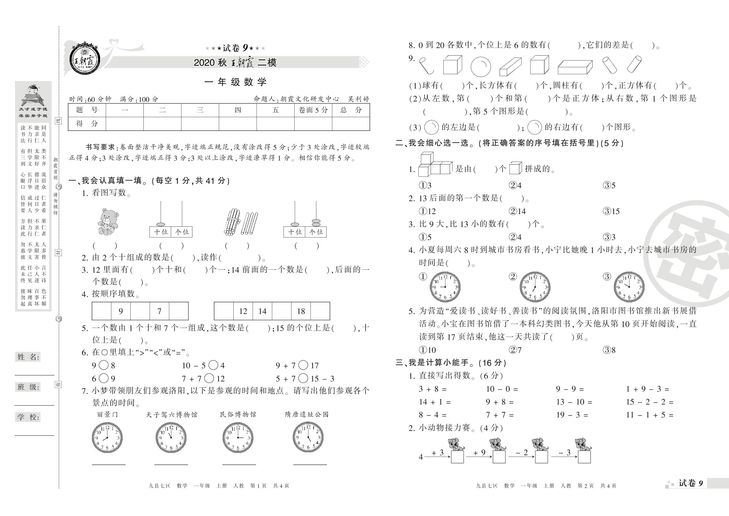 王朝霞期末模拟卷一年级上册数学(人教版)【9】