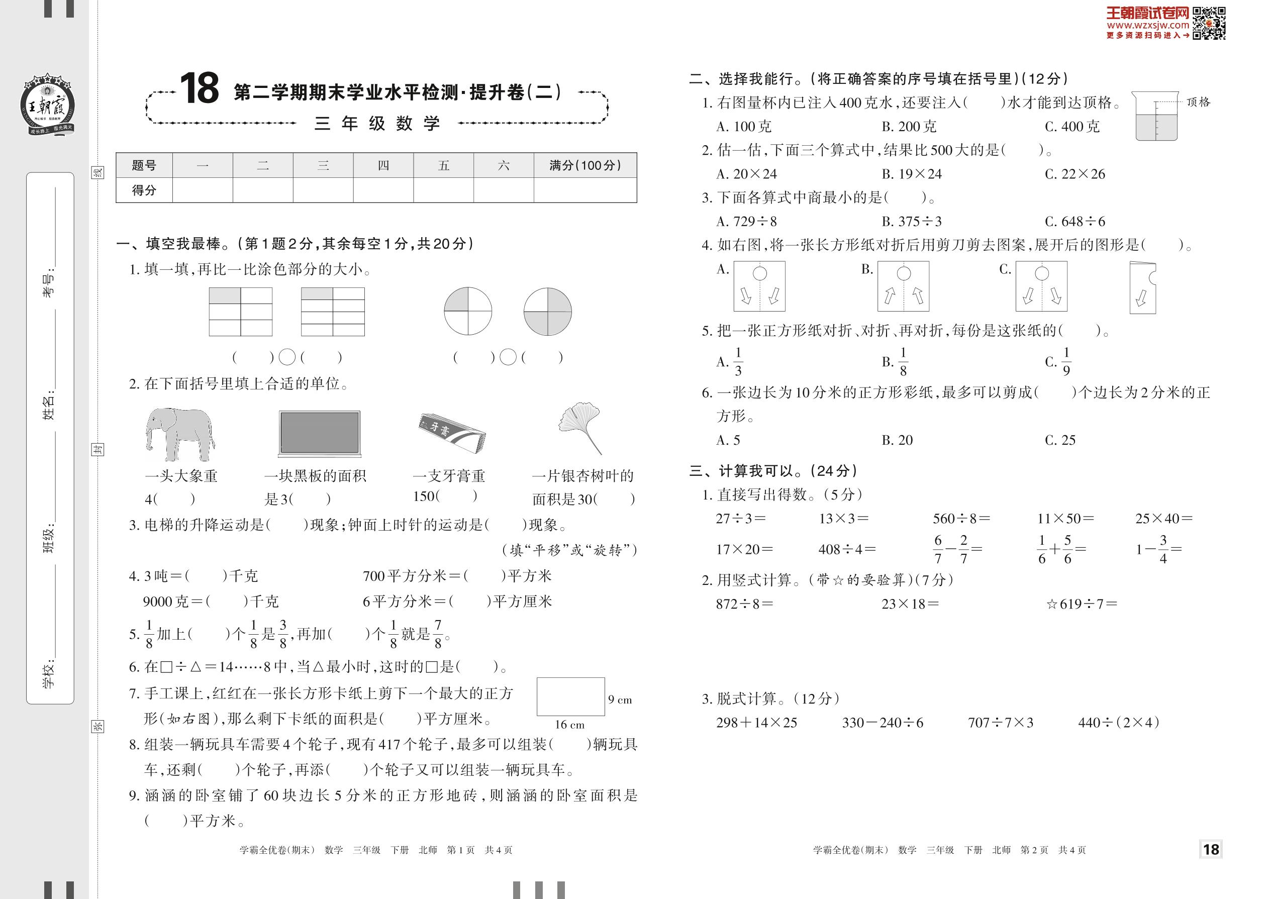 2023下册三年级数学北师版 18 第二学期期末学业水平检测·提升卷(二)