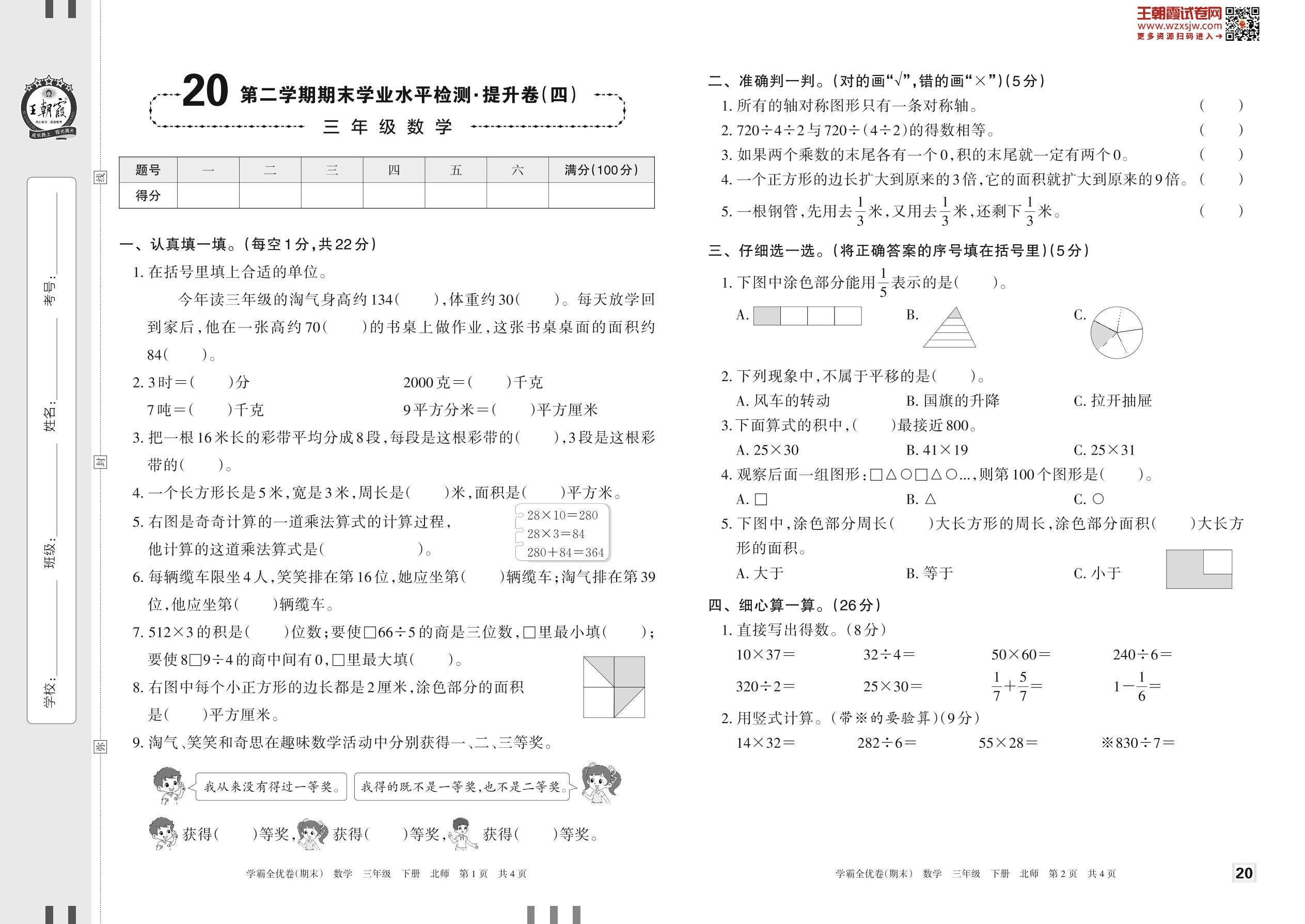 2023下册三年级数学北师版 20 第二学期期末学业水平检测·提升卷(四)