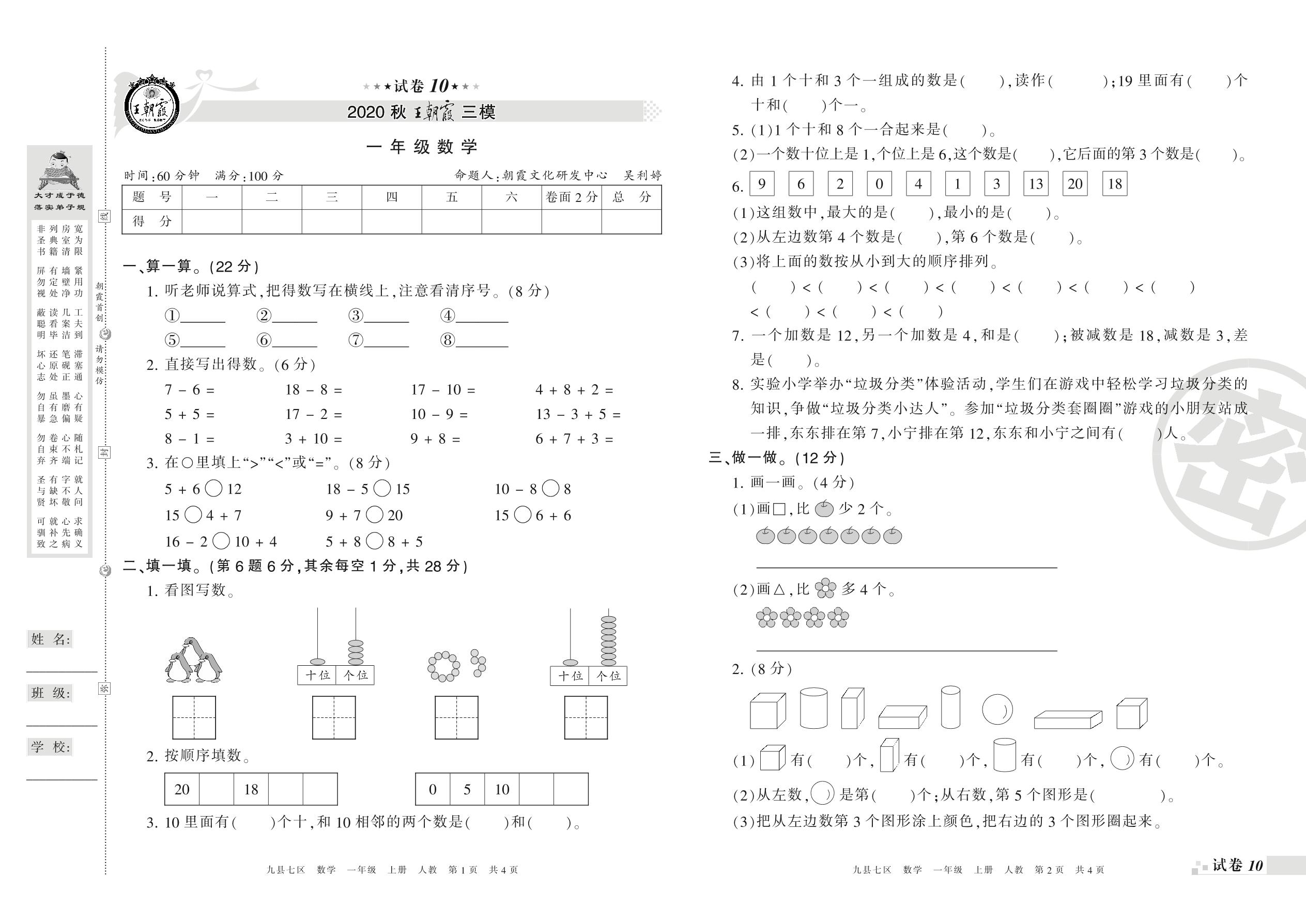 王朝霞期末模拟卷一年级上册数学(人教版)【10】