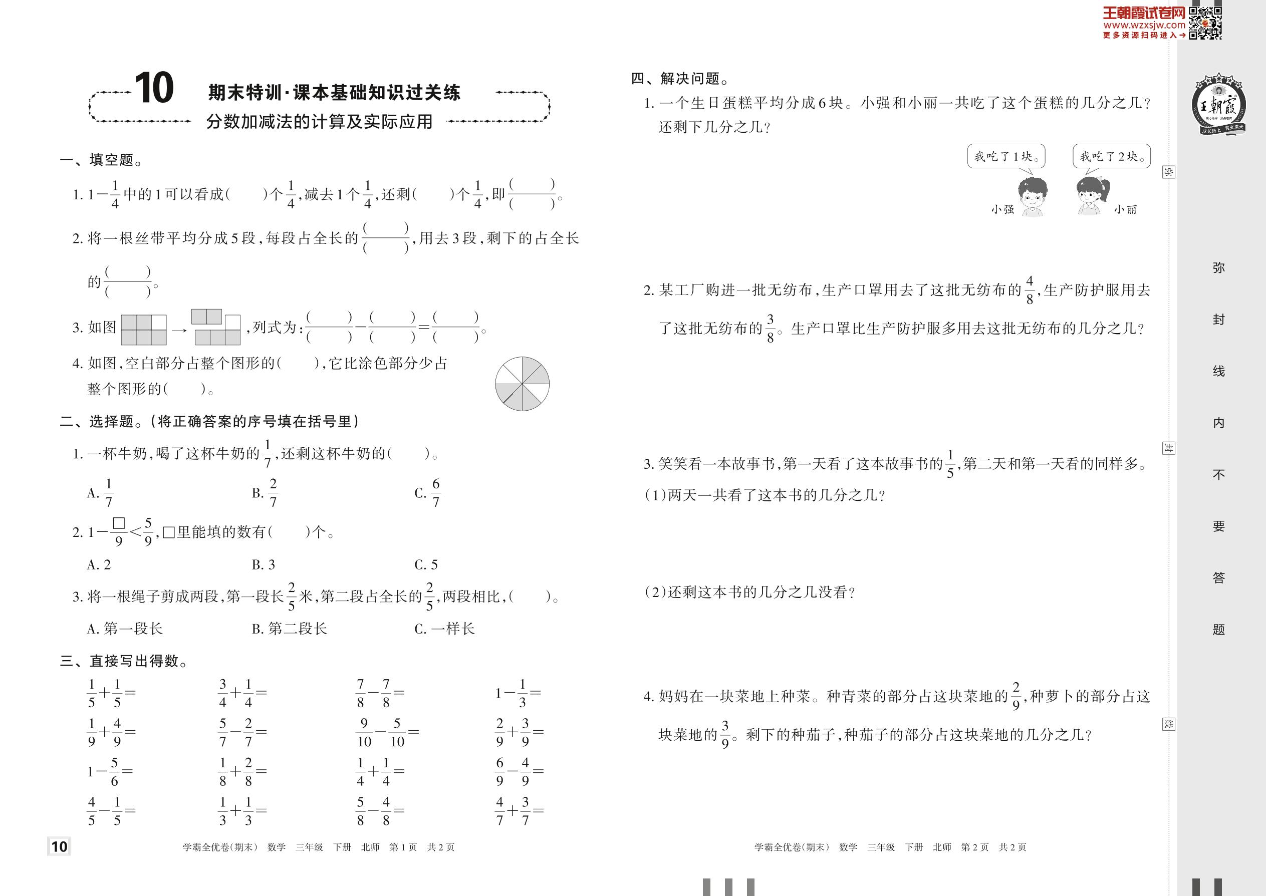 2023下册三年级数学北师版 10 期末特训·课本基础知识过关练——分数加减法的计算及实际应用