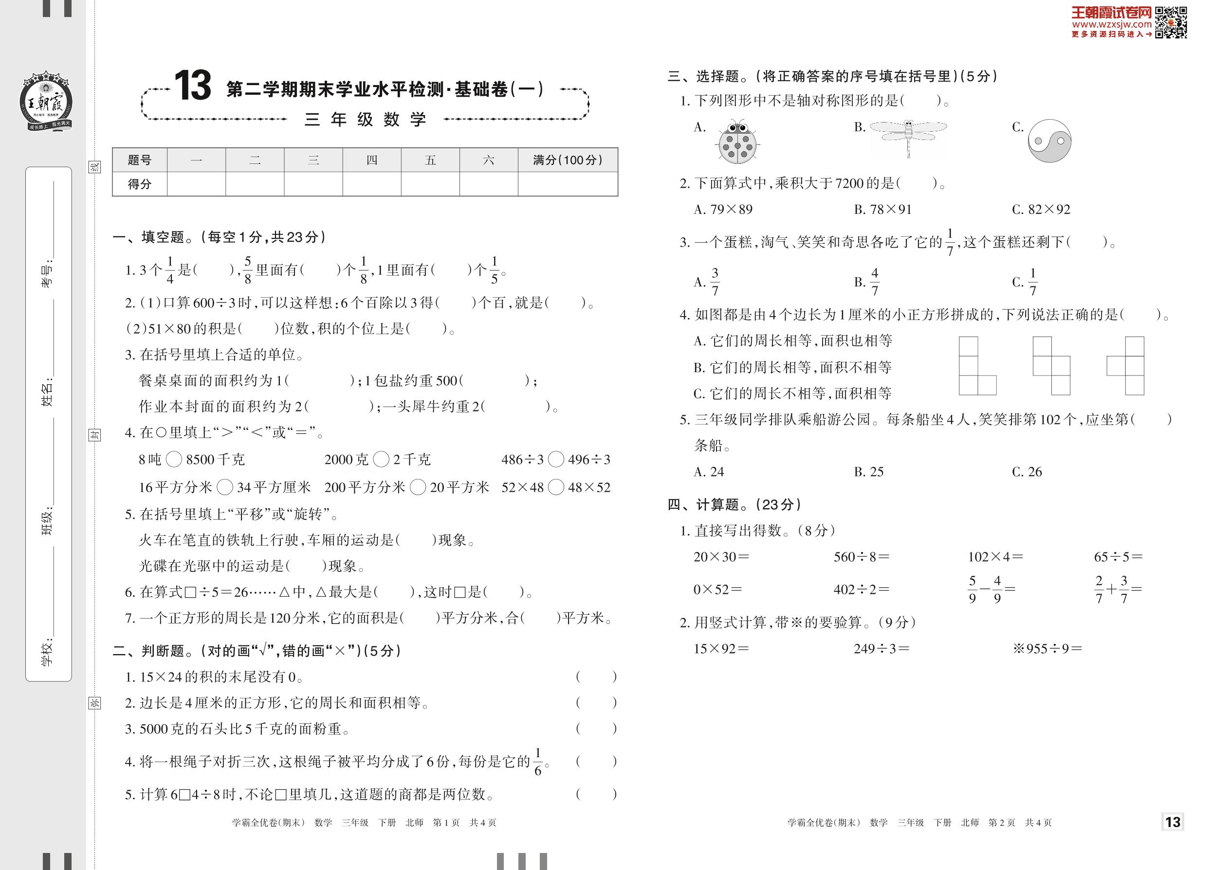 2023下册三年级数学北师版 13 第二学期期末学业水平检测·基础卷(一)