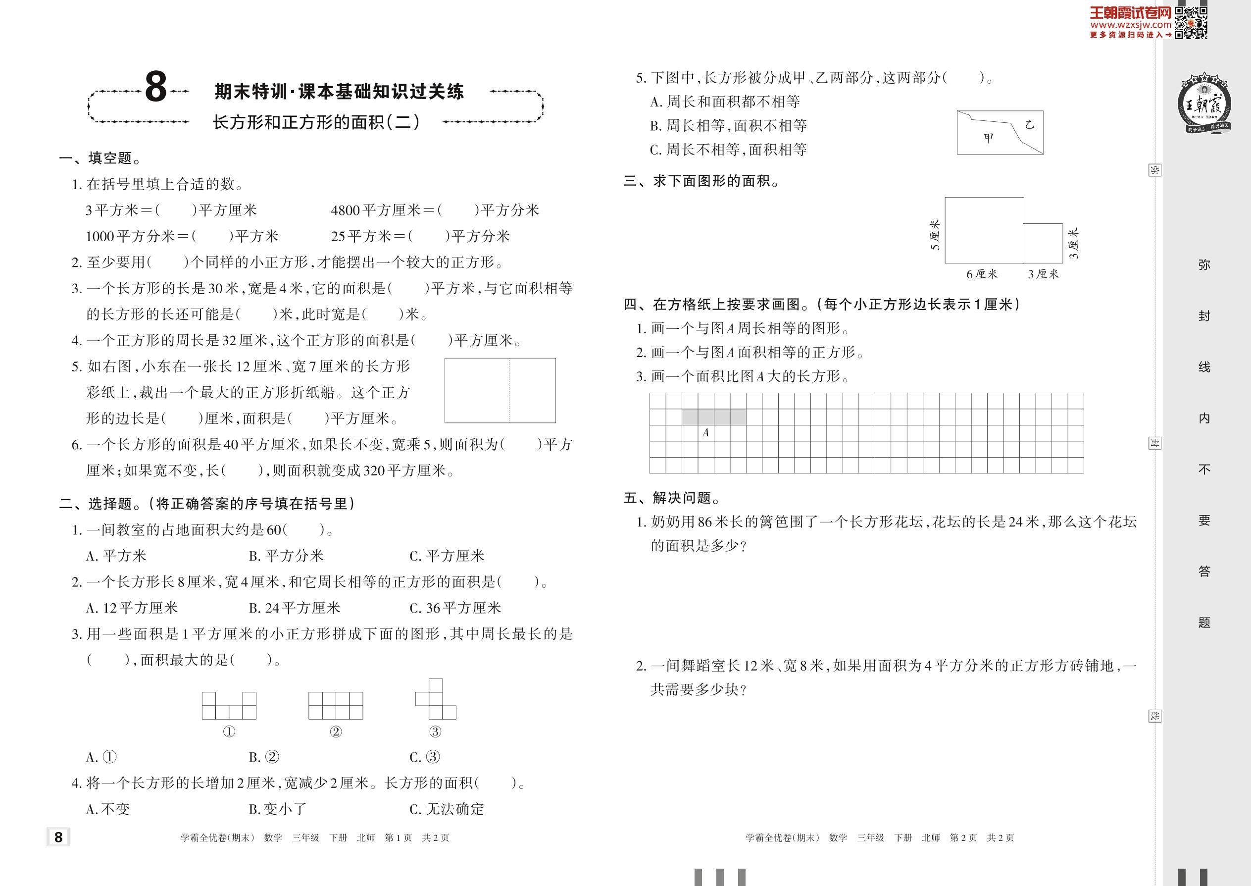 2023下册三年级数学北师版 8 期末特训·课本基础知识过关练——长方形和正方形的面积(二)