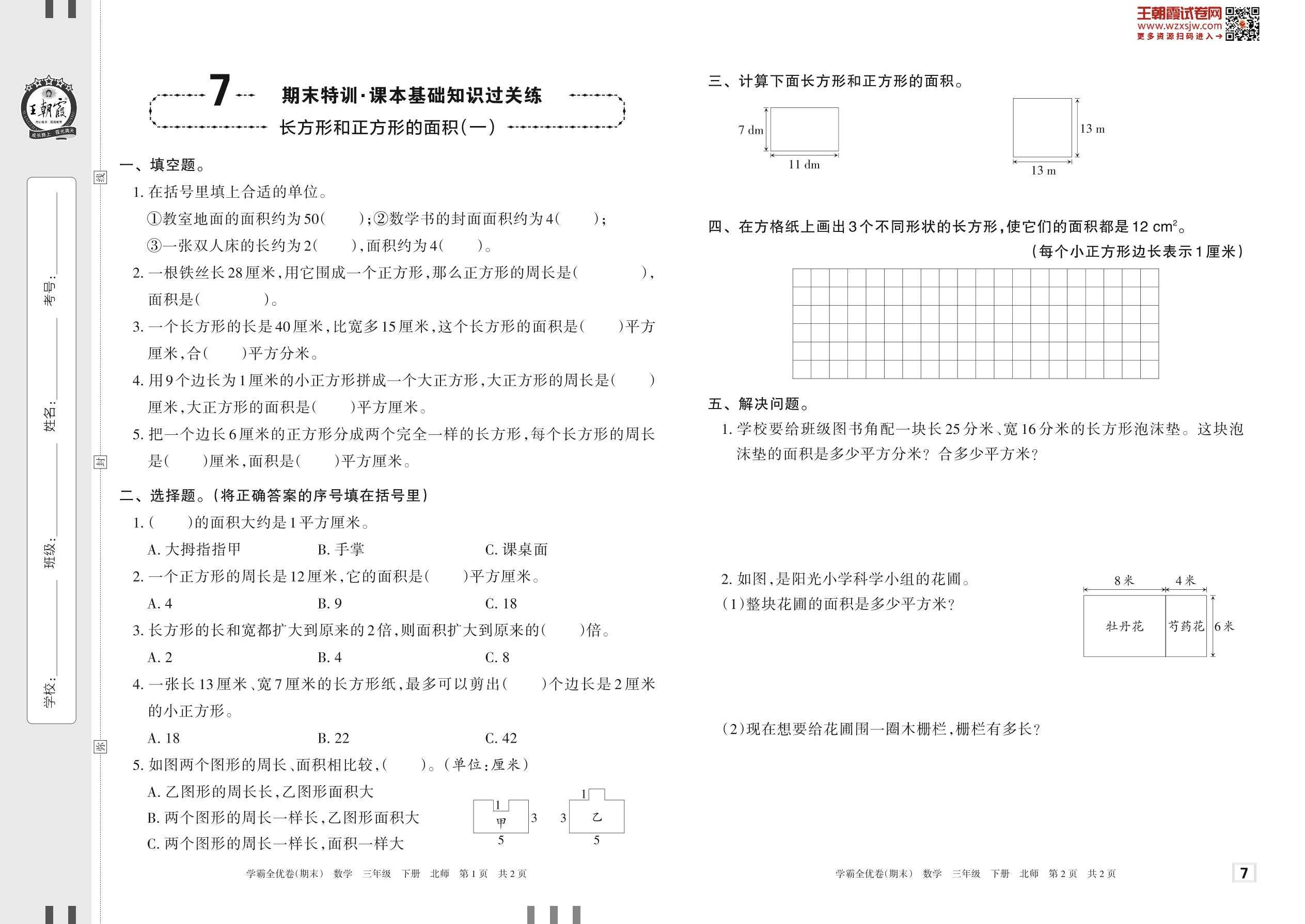 2023下册三年级数学北师版 7 期末特训·课本基础知识过关练——长方形和正方形的面积(一)