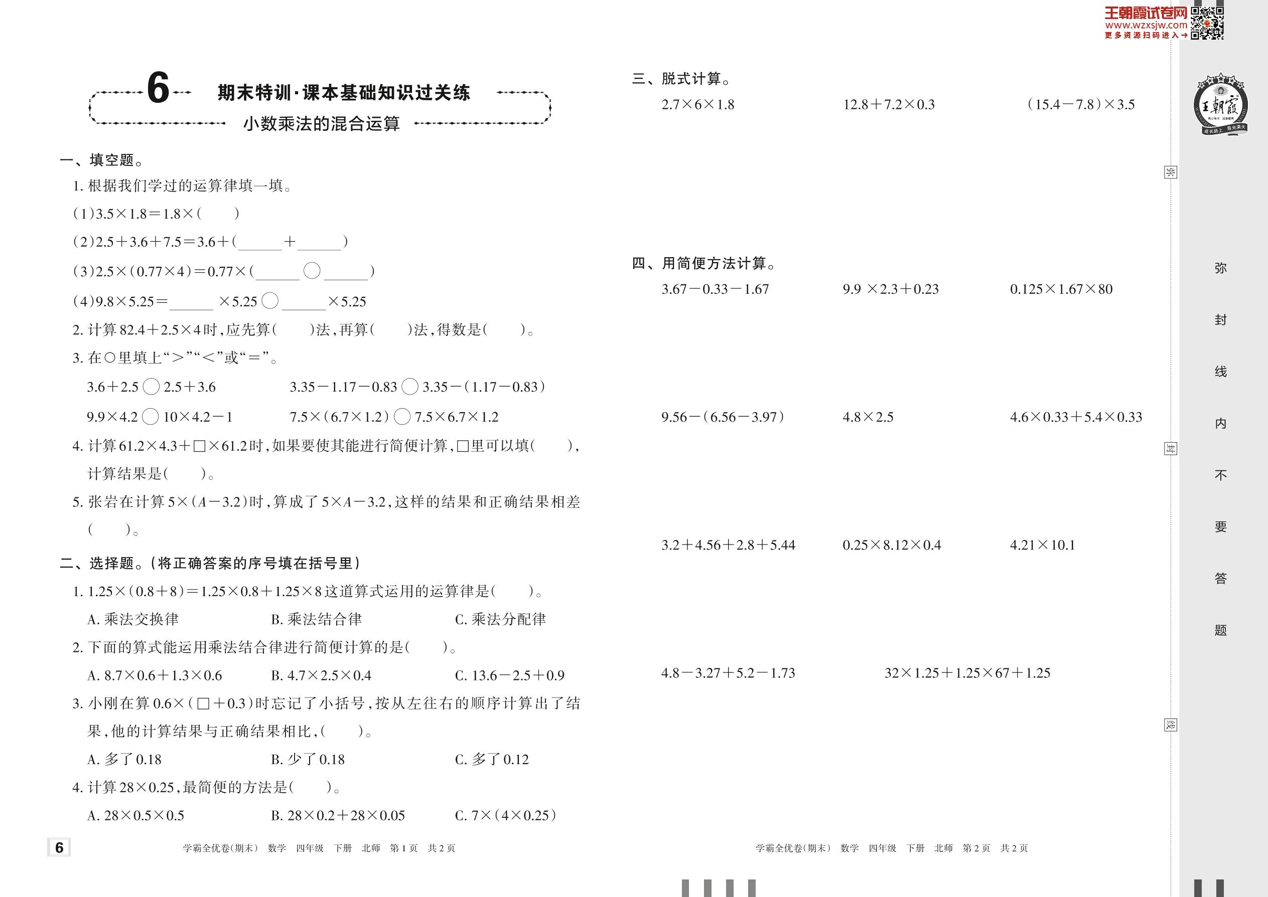 2023下册四年级数学北师版 6 期末特训·课本基础知识过关练——小数乘法的混合运算