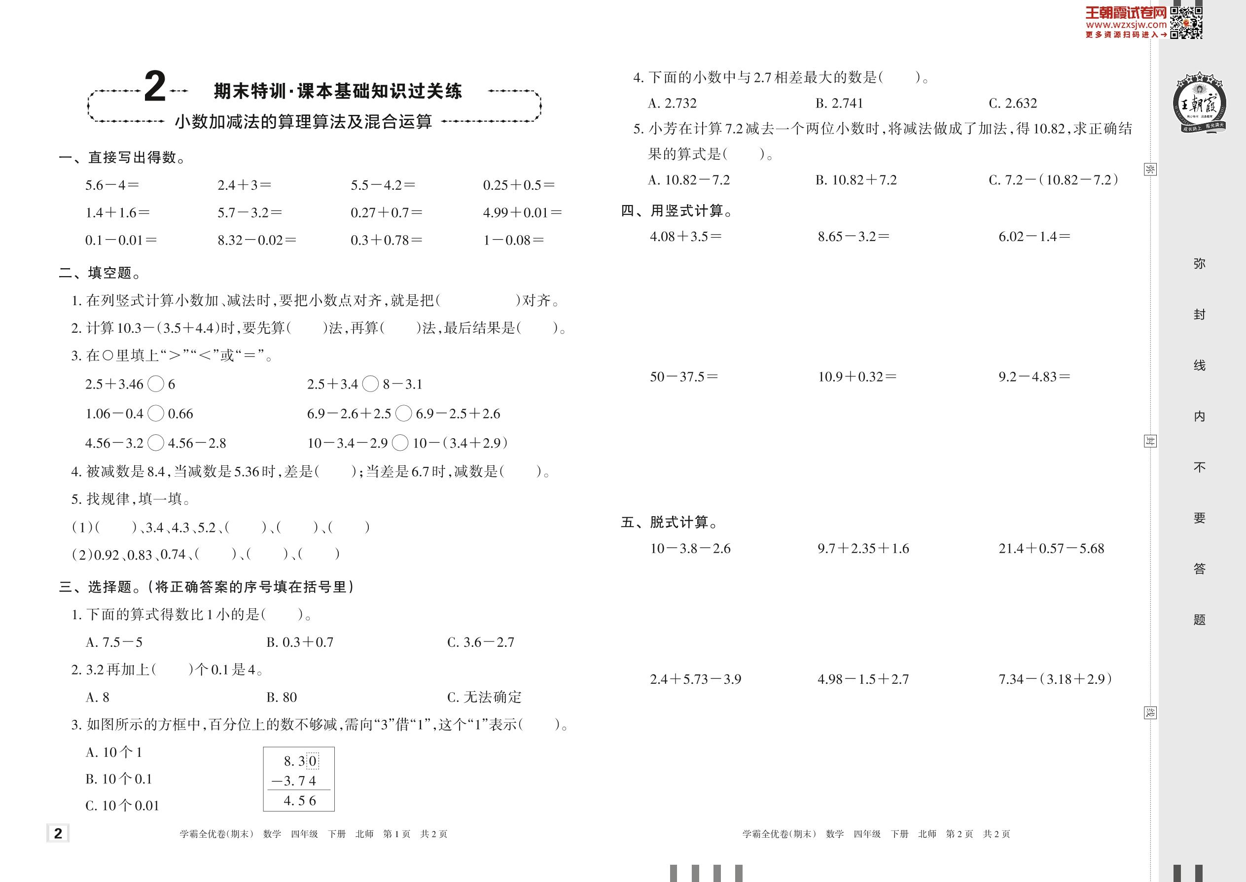 2023下册四年级数学北师版 2 期末特训·课本基础知识过关练——小数加减法的算理算法及混合运算