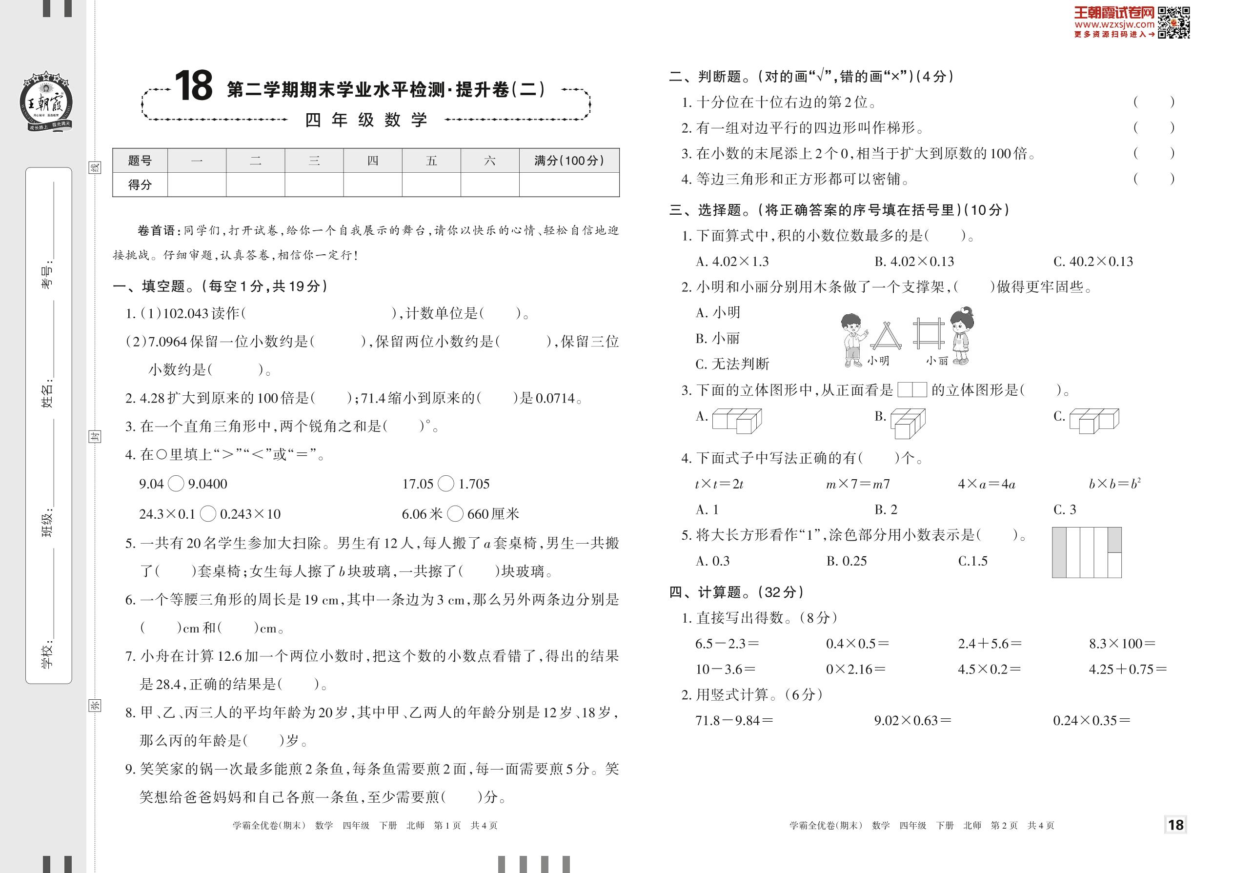 2023下册四年级数学北师版 18 第二学期期末学业水平检测·提升卷(二)