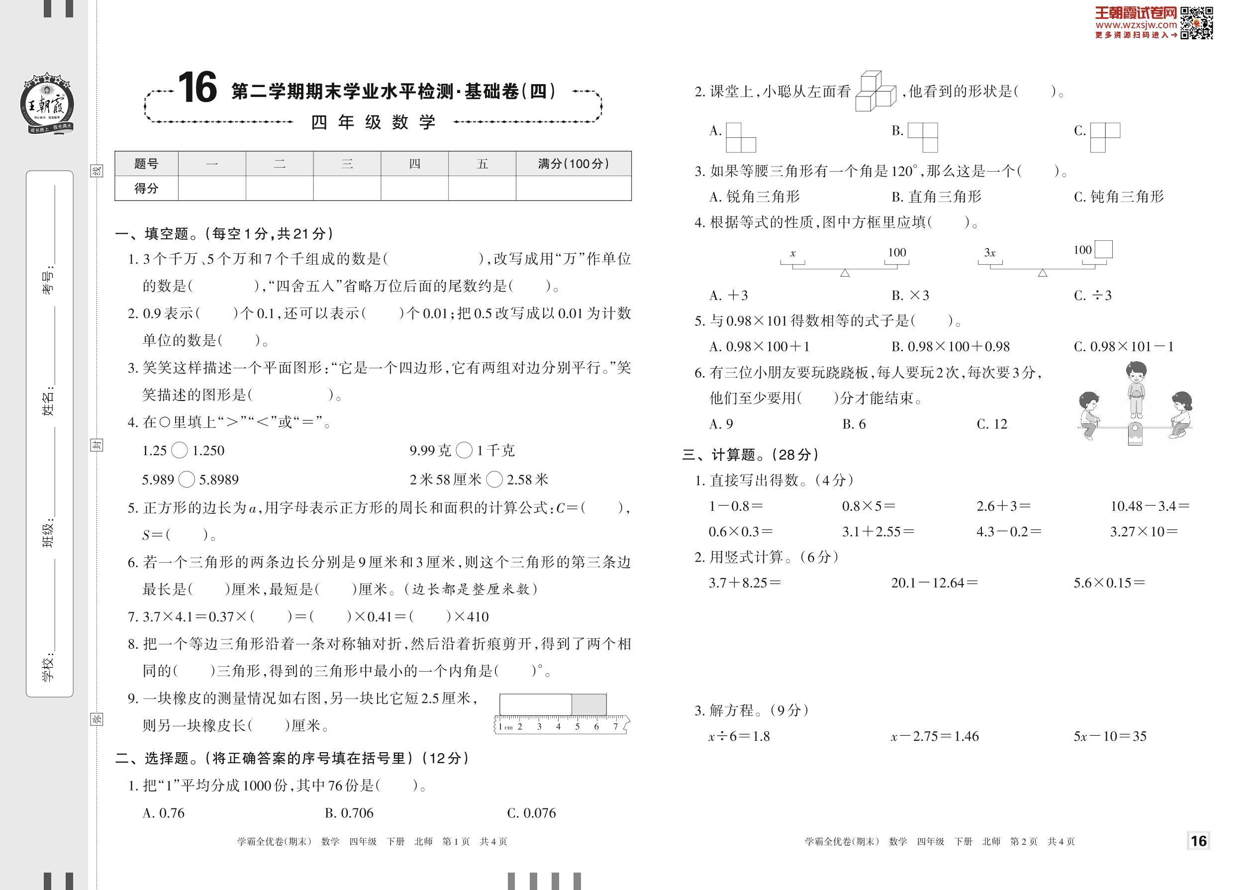 2023下册四年级数学北师版 16 第二学期期末学业水平检测·基础卷(四)