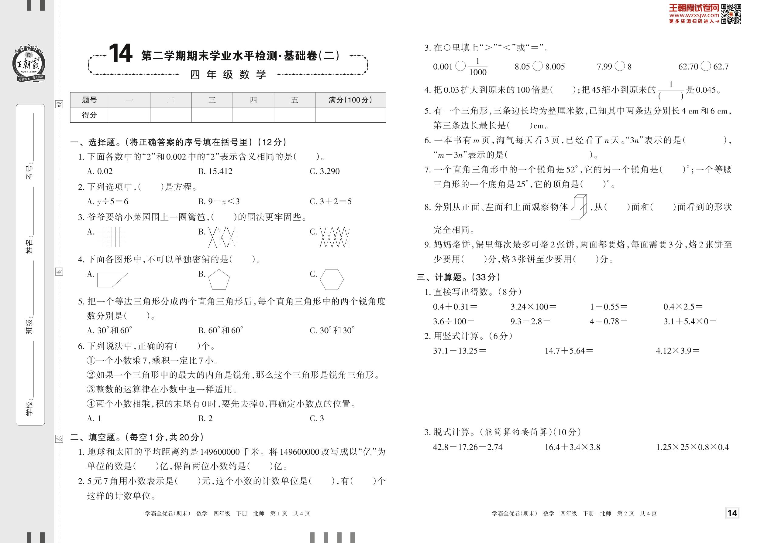 2023下册四年级数学北师版 14 第二学期期末学业水平检测·基础卷(二)