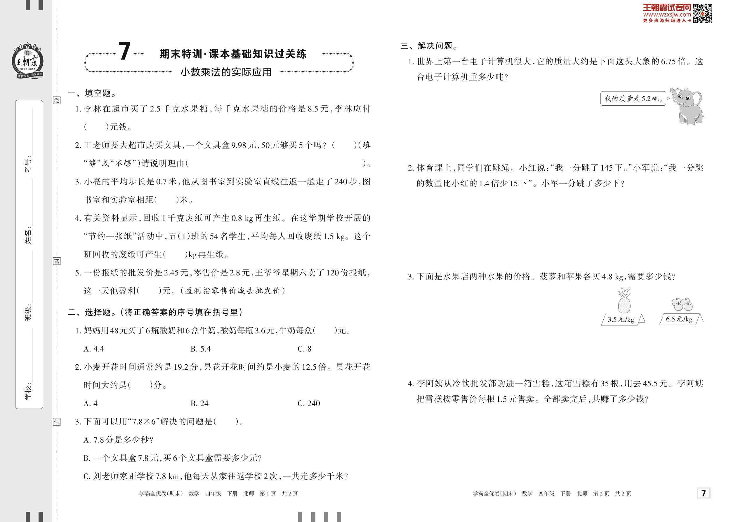 2023下册四年级数学北师版 7 期末特训·课本基础知识过关练——小数乘法的实际应用