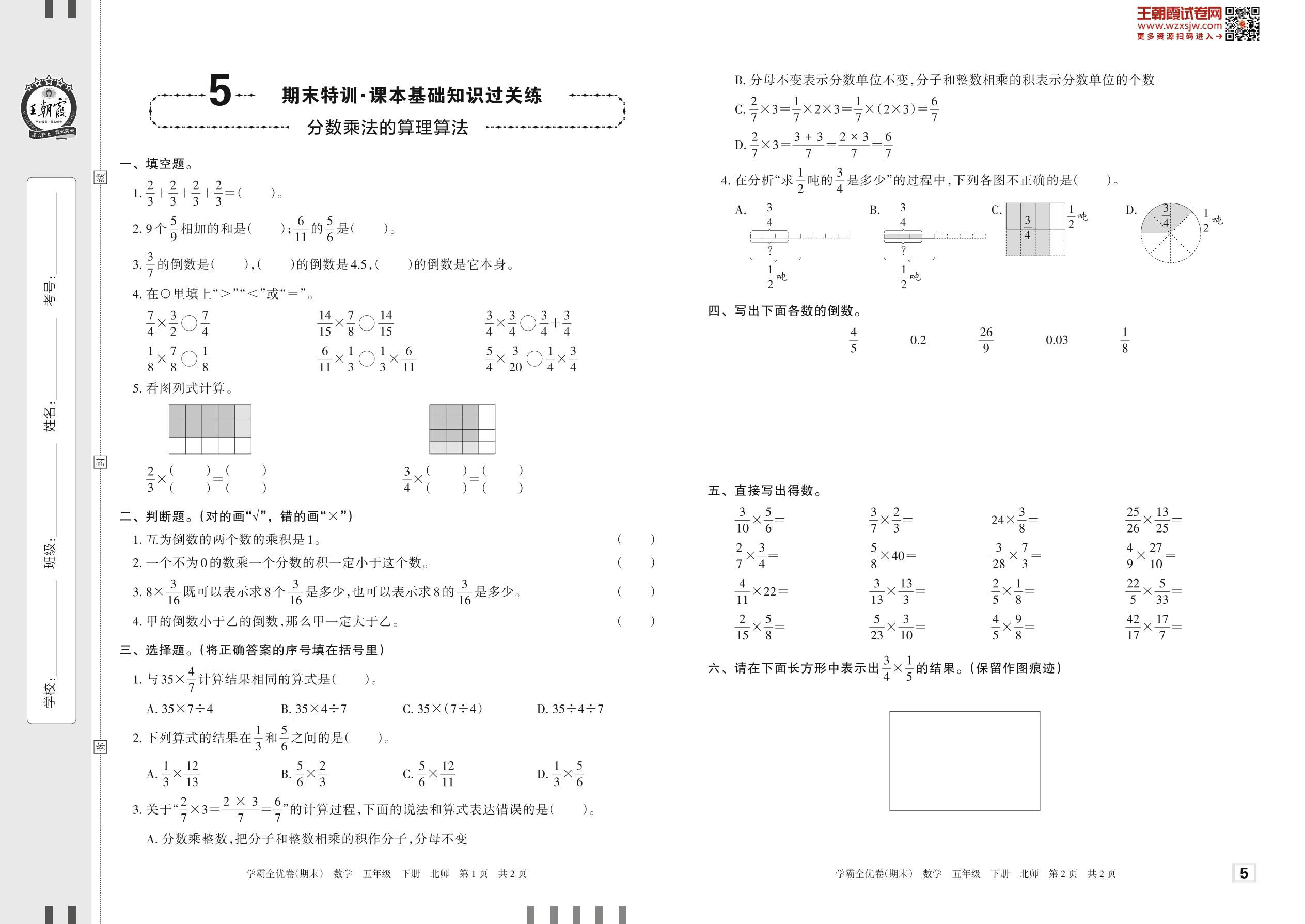 2023下册五年级数学北师版 5 期末特训·课本基础知识过关练——分数乘法的算理算法