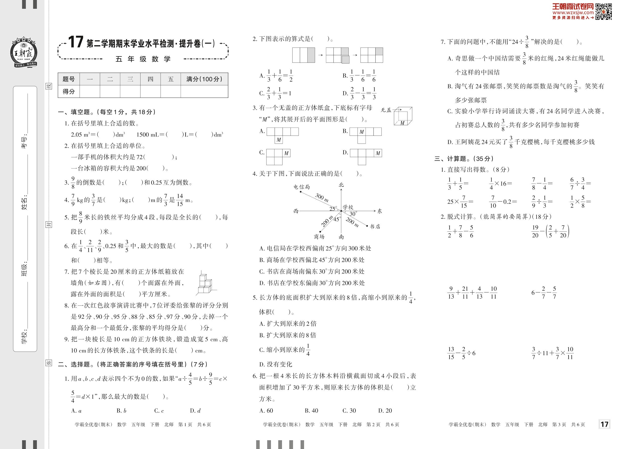 2023下册五年级数学北师版 17 第二学期期末学业水平检测·提升卷(一)