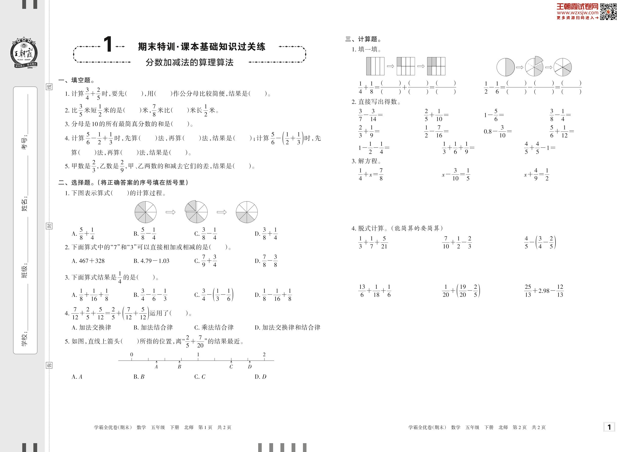 2023下册五年级数学北师版 1 期末特训·课本基础知识过关练——分数加减法的算理算法