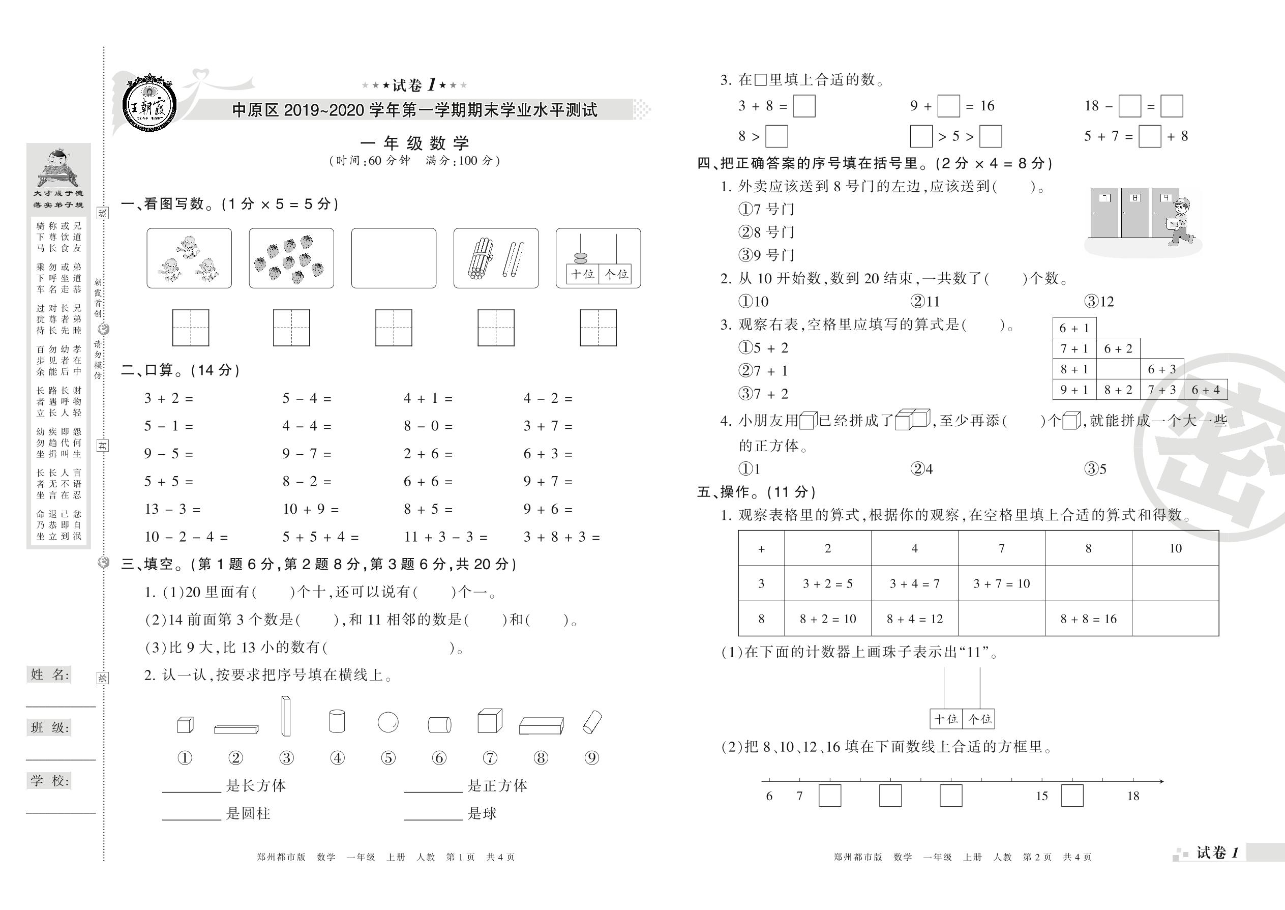 2019-2020学年第一学期郑州市中原区一年级数学试卷(人教版)【1】
