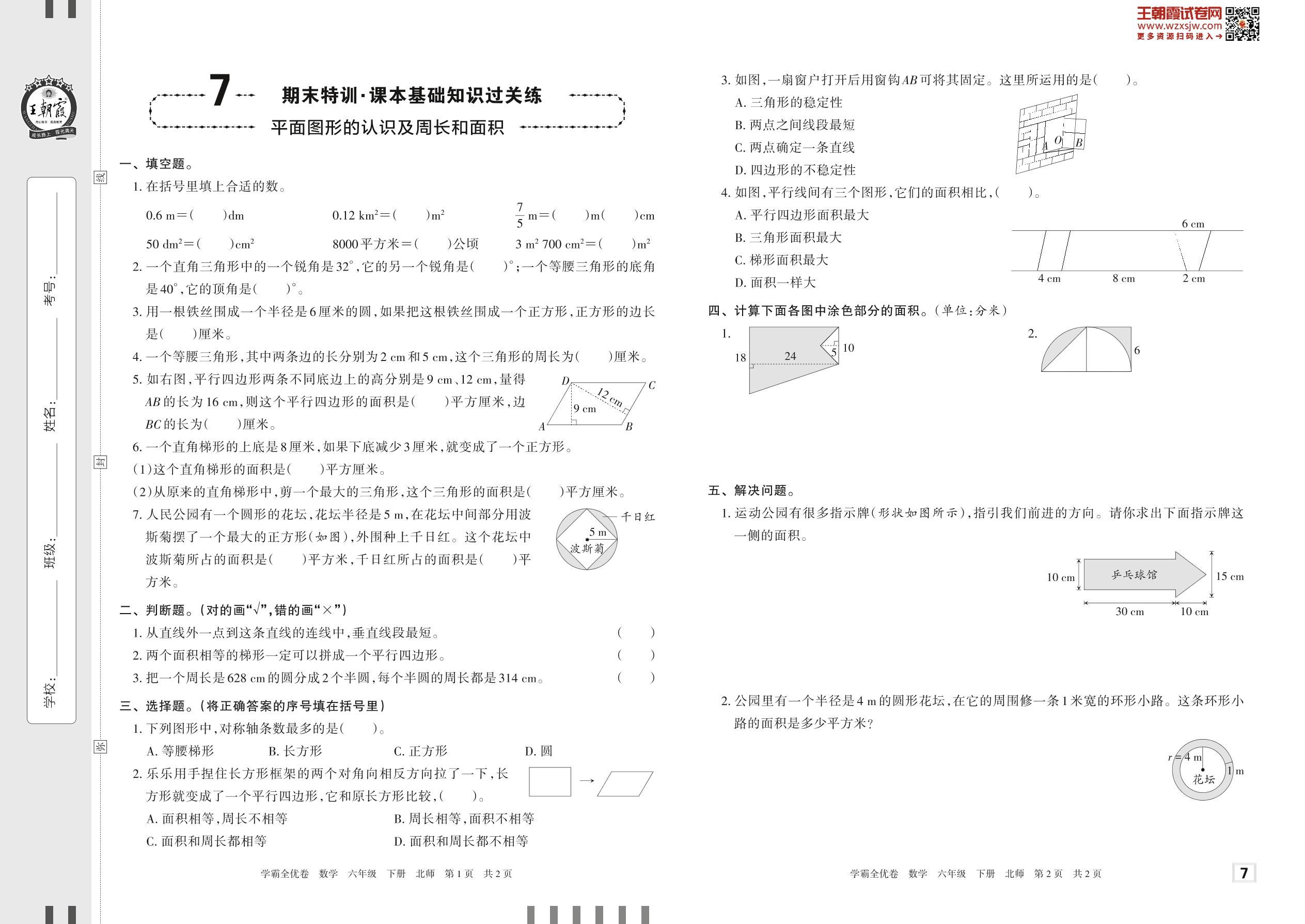 2023下册六年级数学北师版 7 期末特训·课本基础知识过关练——平面图形的认识及周长和面积