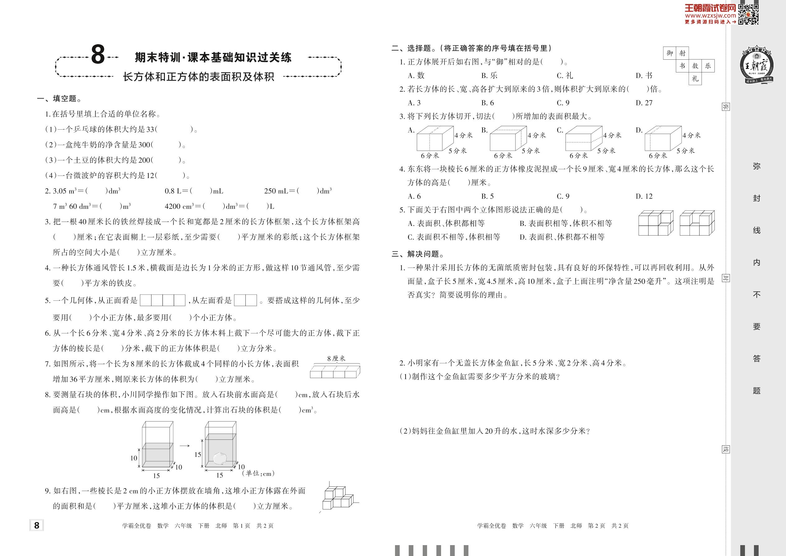 2023下册六年级数学北师版 8 期末特训·课本基础知识过关练——长方体和正方体的表面积及体积