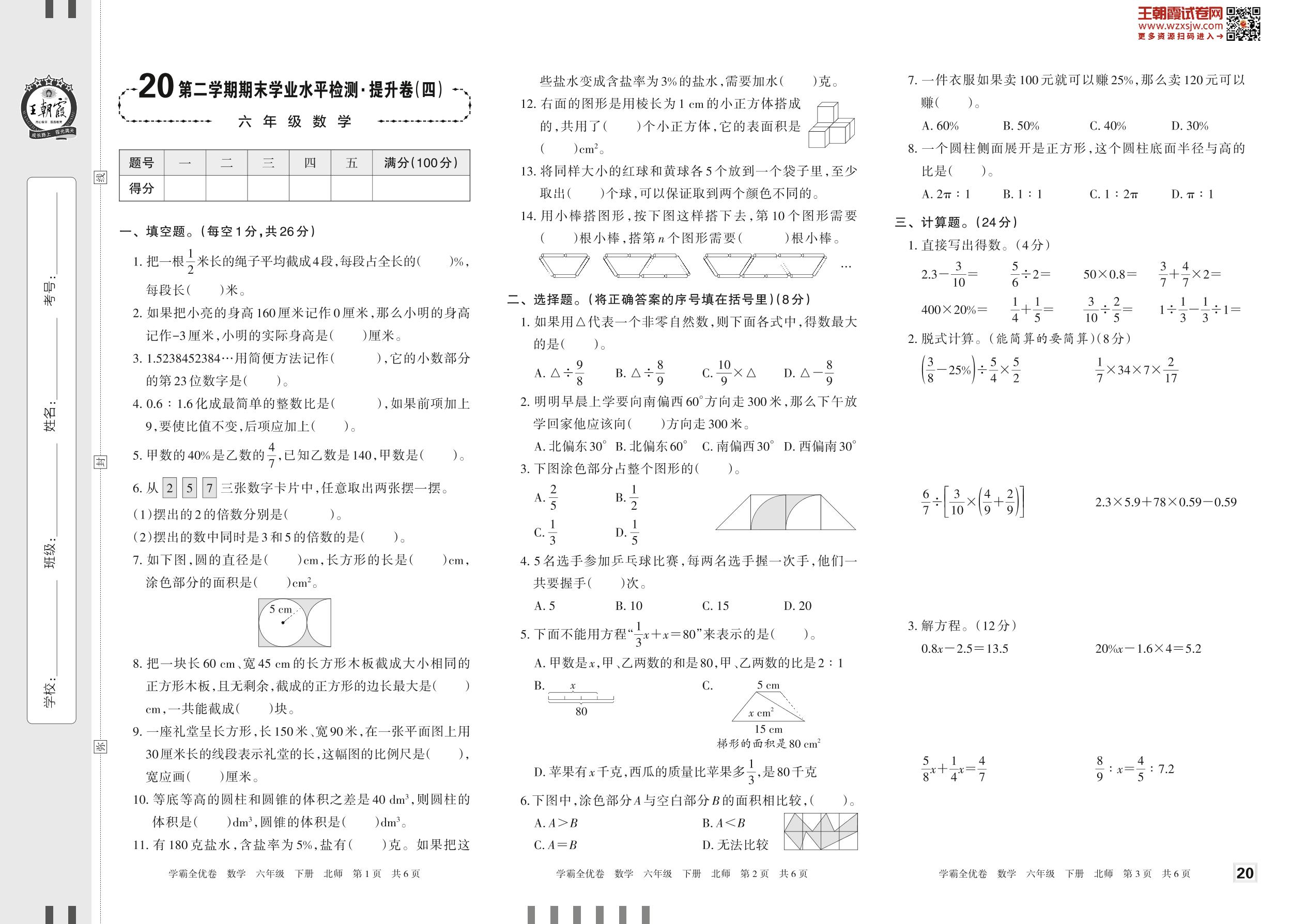 2023下册六年级数学北师版 20 第二学期期末学业水平检测·提升卷(四)