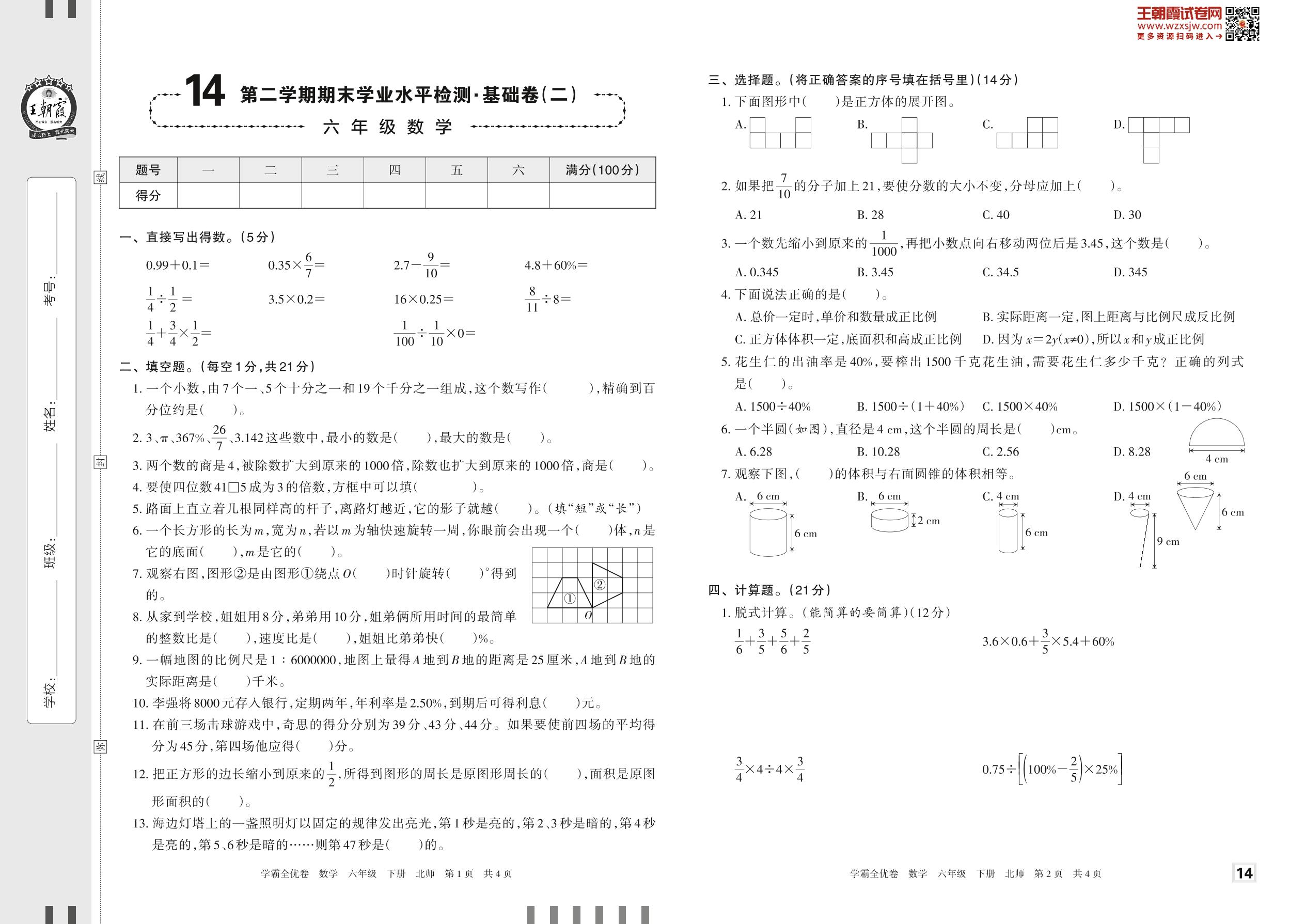 2023下册六年级数学北师版 14 第二学期期末学业水平检测·基础卷(二)