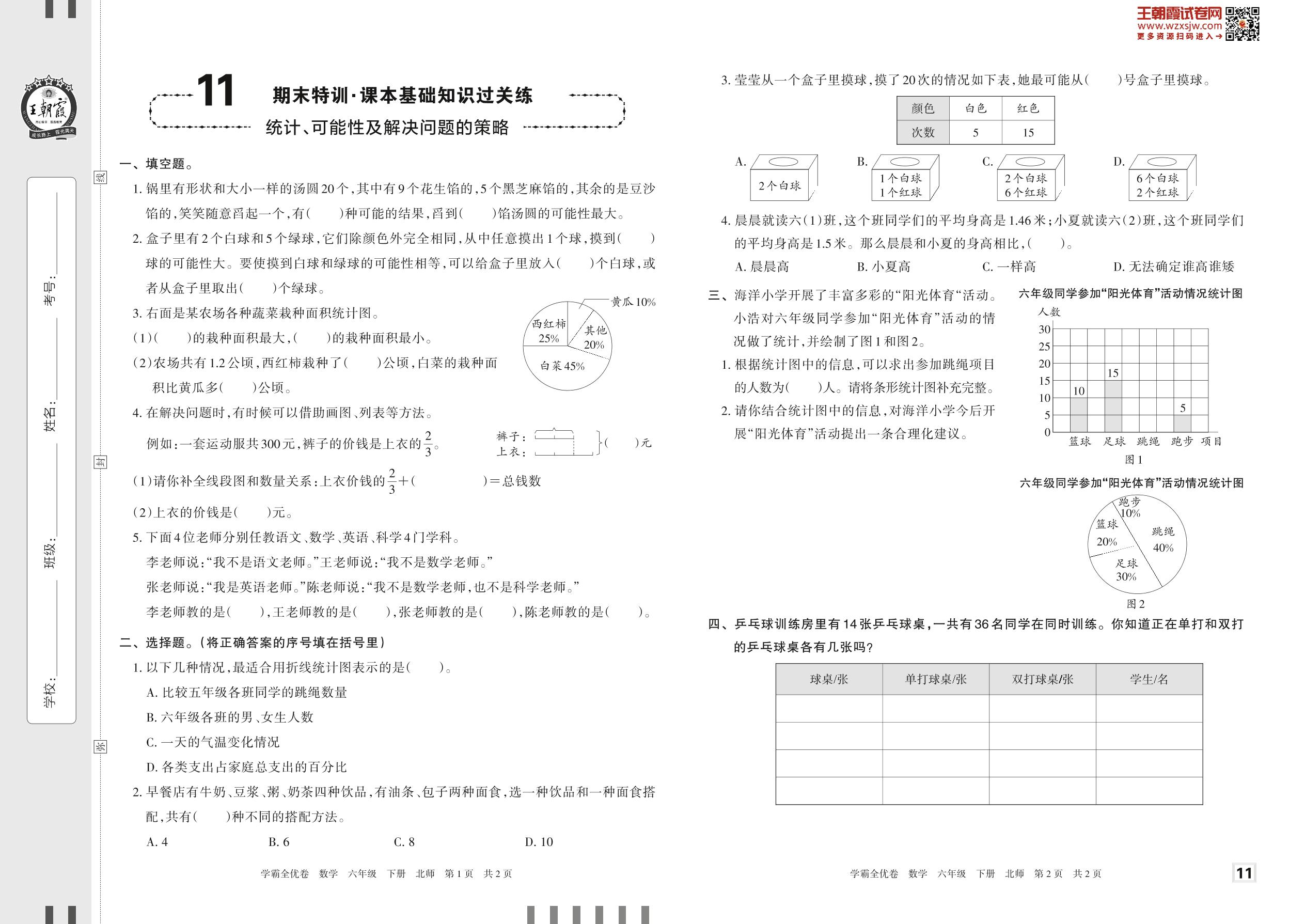 2023下册六年级数学北师版 11 期末特训·课本基础知识过关练——统计、可能性及解决问题的策略