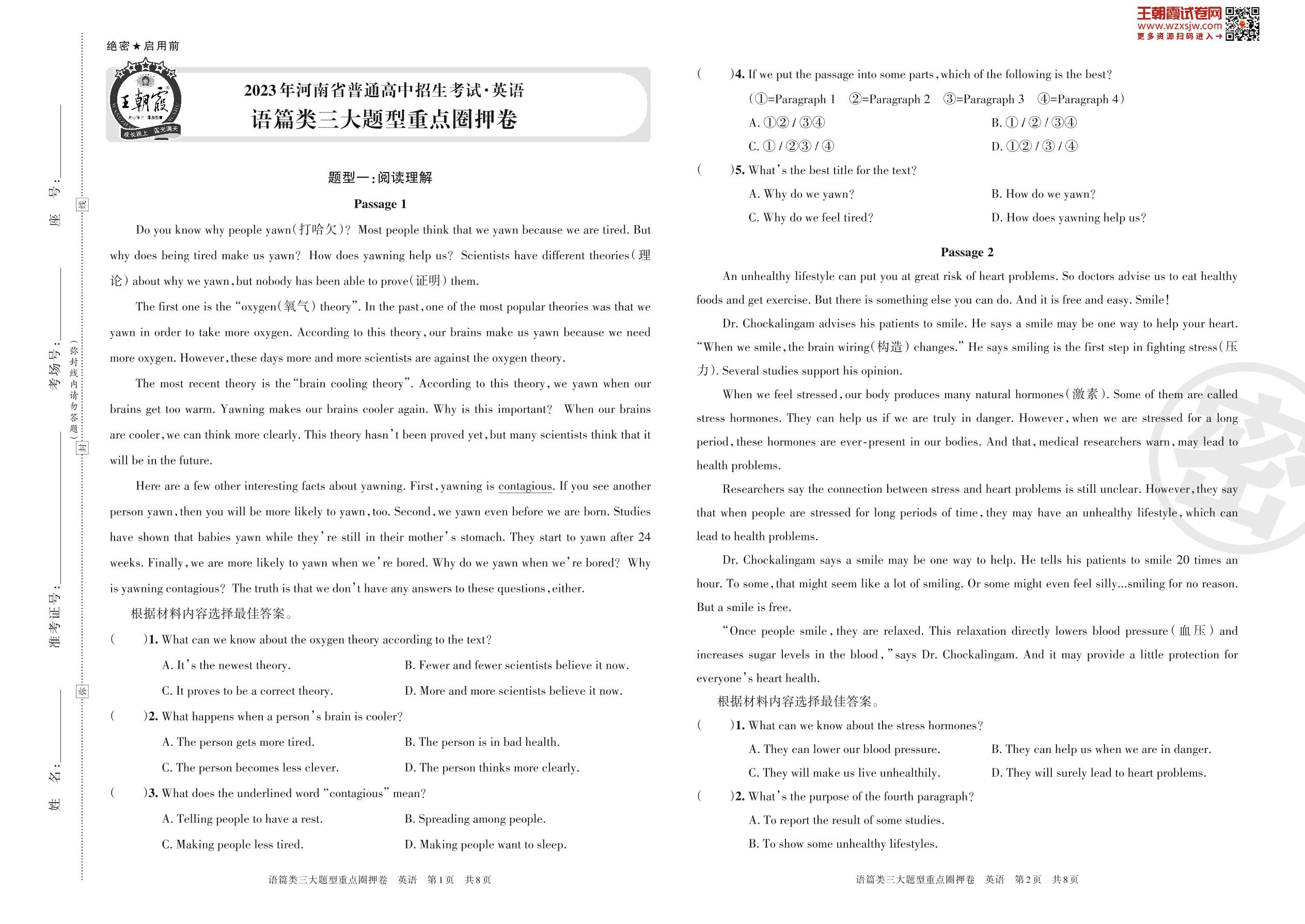 2023年河南省普通高中招生考试试卷·英语 语篇类三大题型重点圈押卷