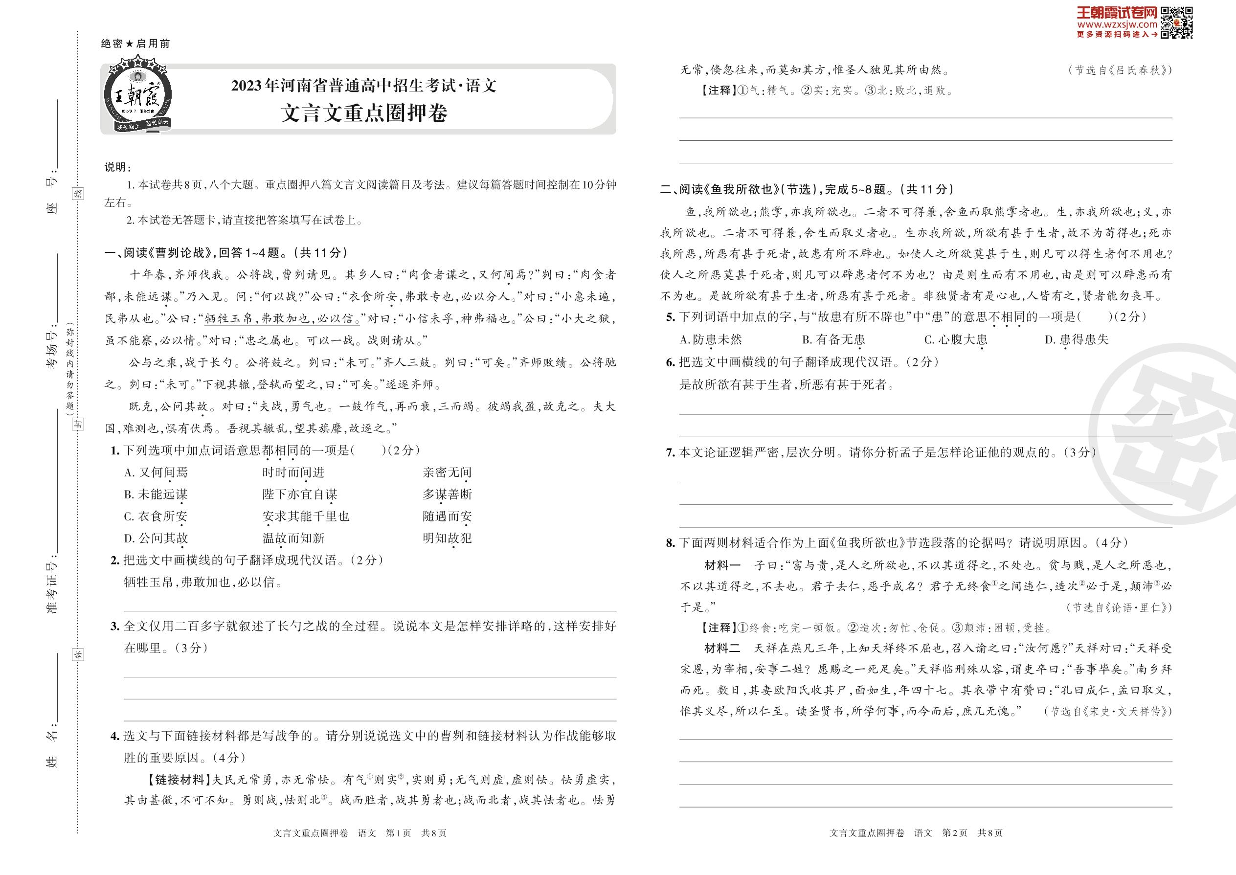 2023年河南省普通高中招生考试试卷·语文 文言文重点圈押卷