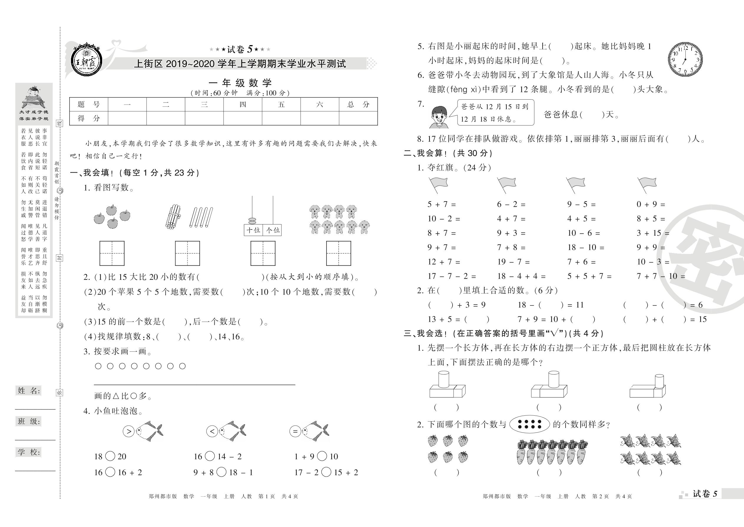 2019-2020学年第一学期郑州市上街区一年级数学试卷(人教版)【5】