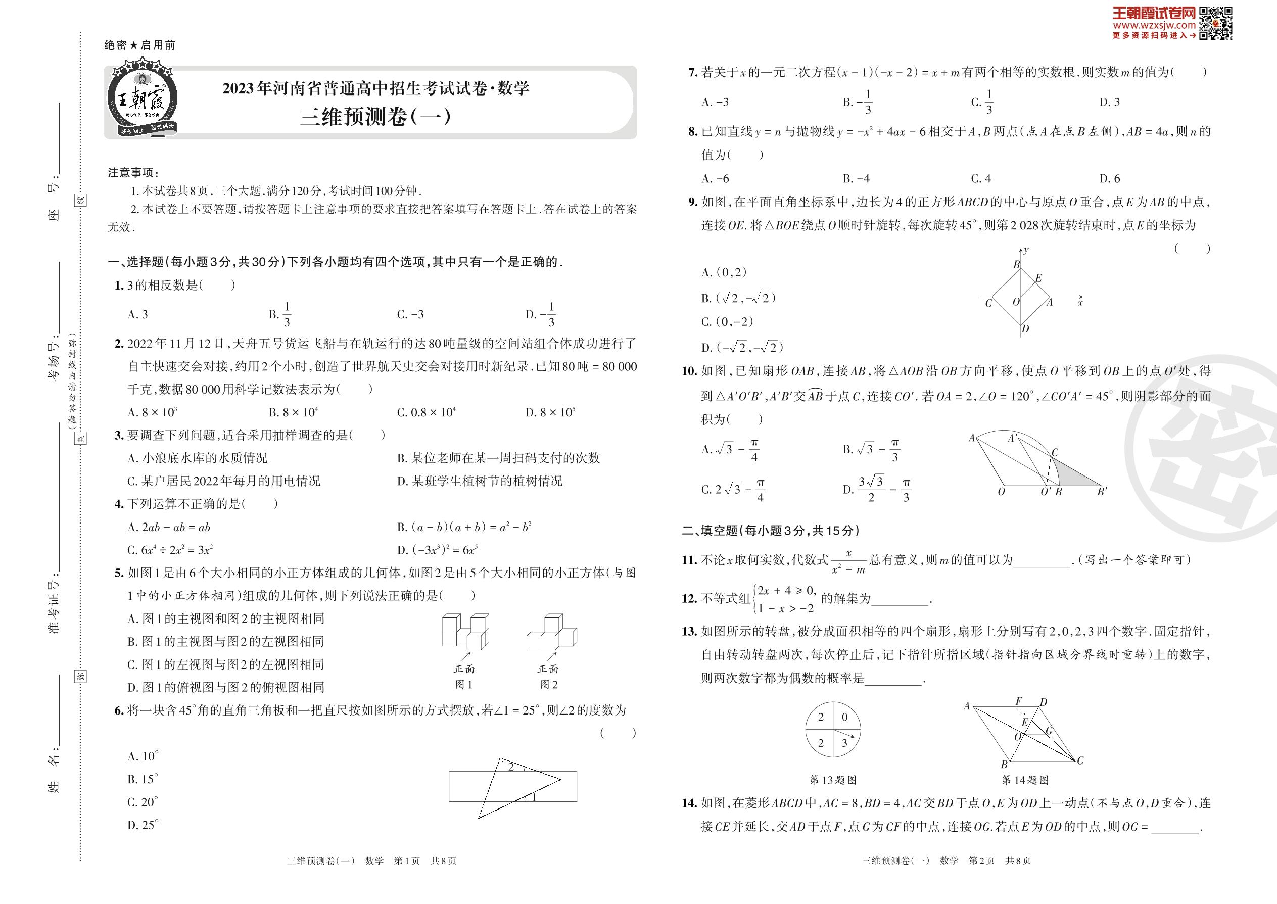 2023年河南省普通高中招生考试试卷·数学 三维预测卷(一)