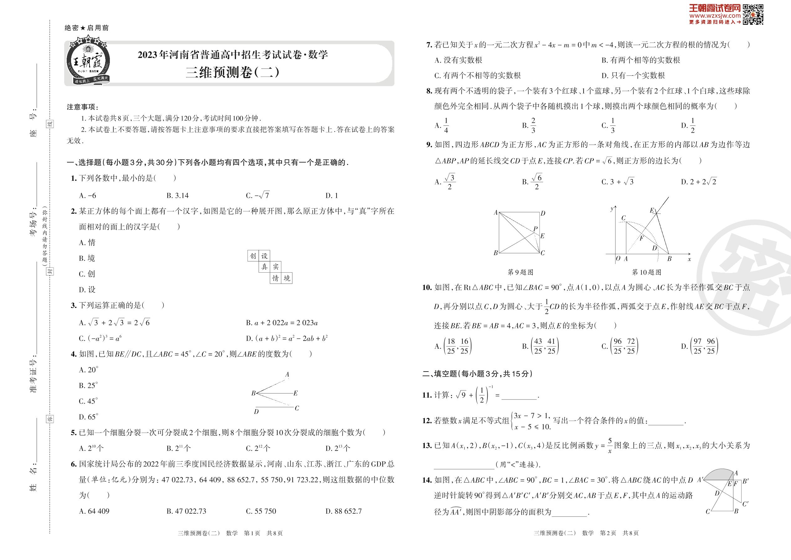 2023年河南省普通高中招生考试试卷·数学 三维预测卷(二)