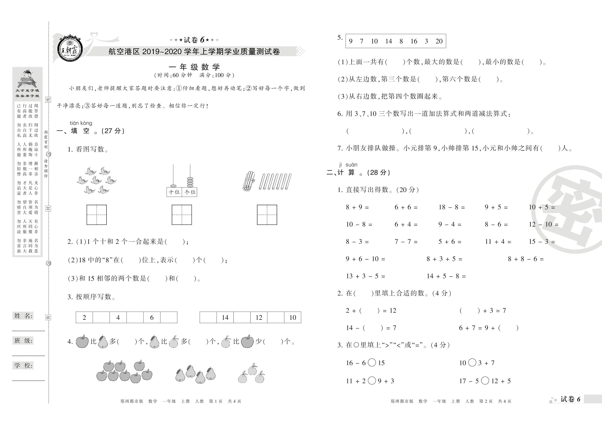 2019-2020学年第一学期郑州市航空港区一年级数学试卷(人教版)【6】