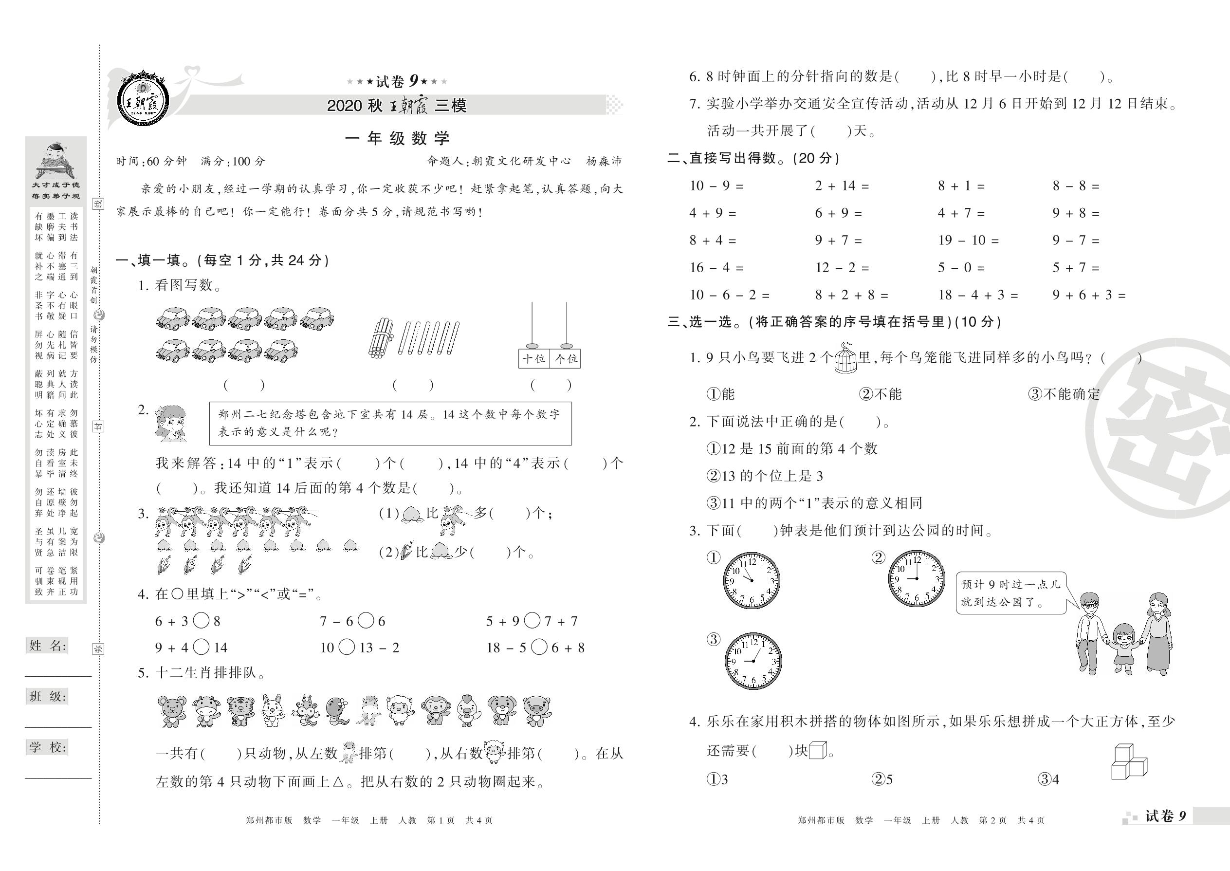 王朝霞期末模拟卷一年级上册数学(人教版)_R210802212851【9】