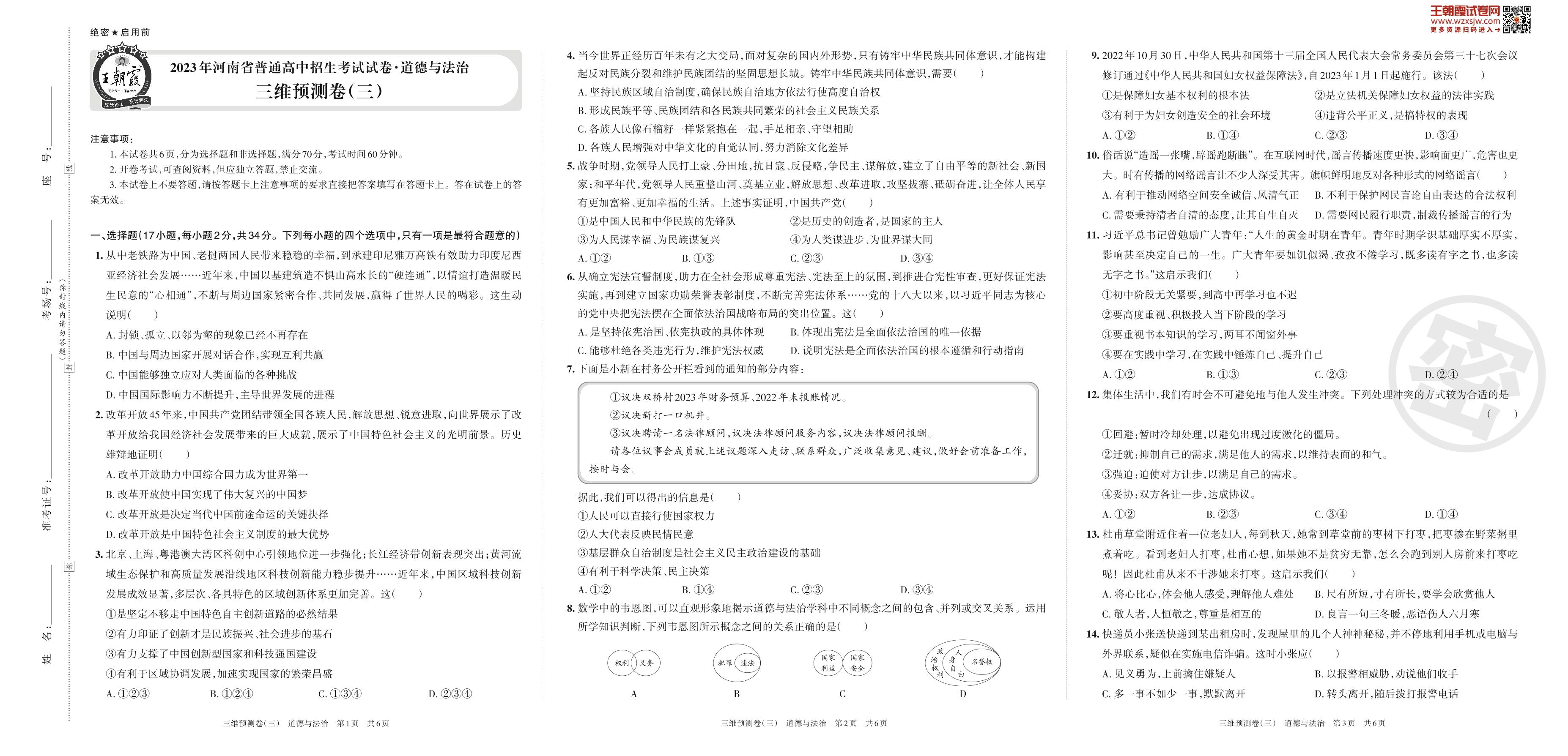2023年河南省普通高中招生考试试卷·道德与法治 三维预测卷(三)