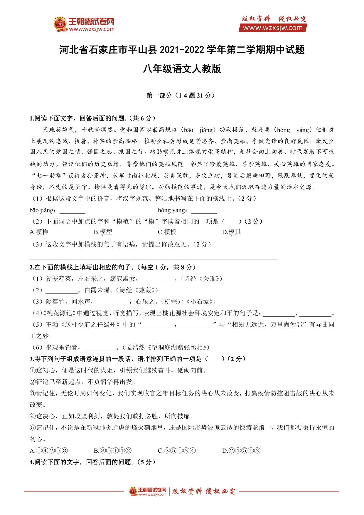 河北省石家庄市平山县2021-2022学年第二学期期中试题八年级语文(人教版)