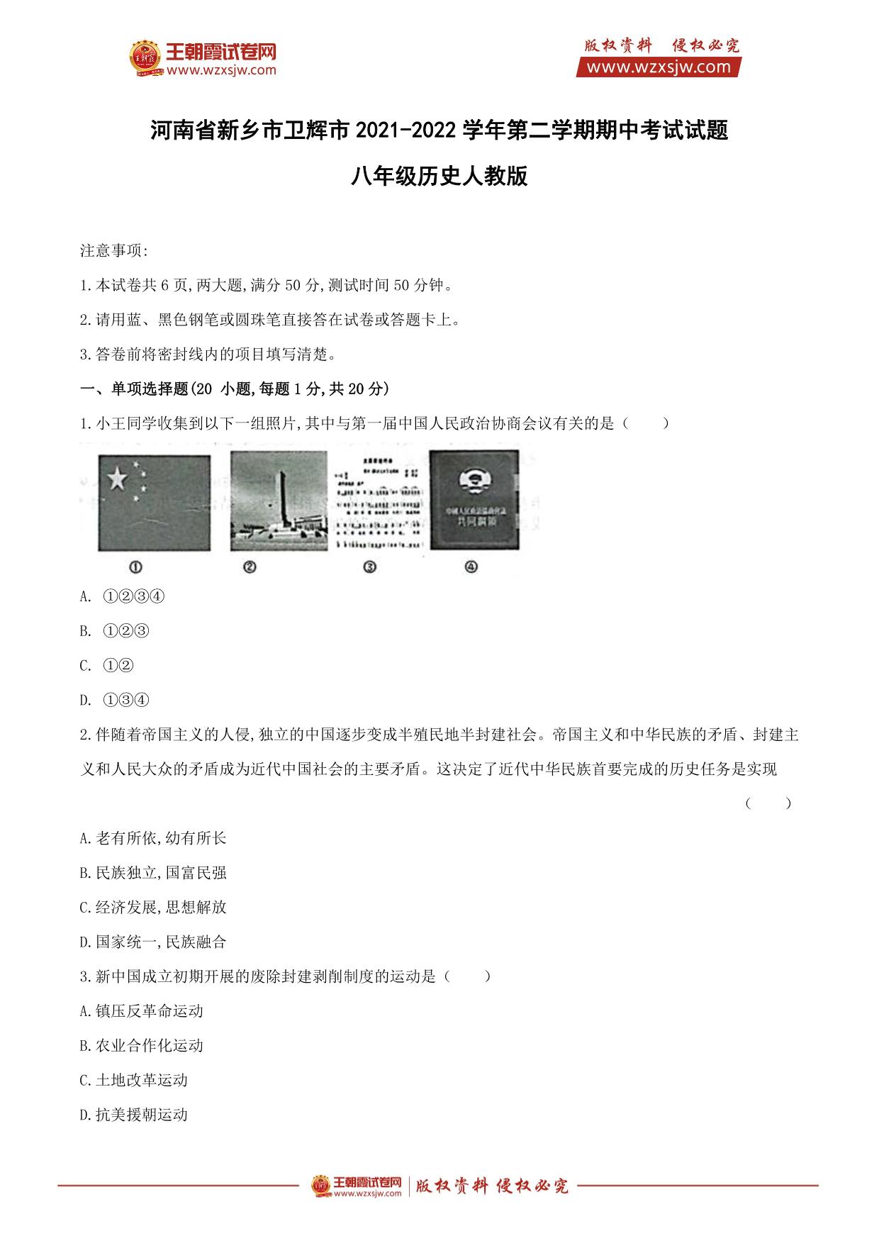 河南省新乡市卫辉市2021-2022学年第二学期期中考试试题八年级历史(人教版)