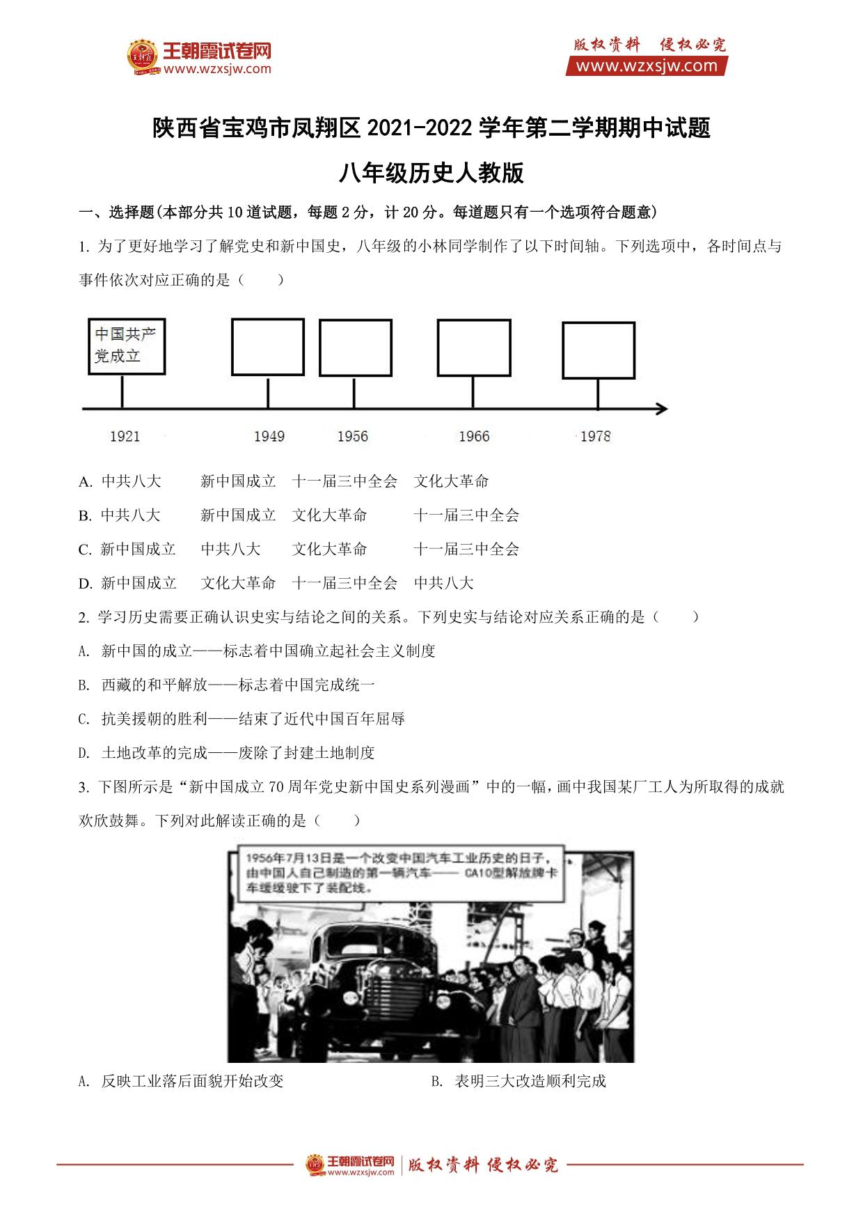 陕西省宝鸡市凤翔区2021-2022学年第二学期期中试题八年级历史(人教版)
